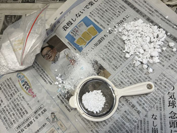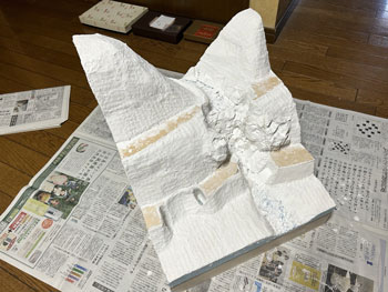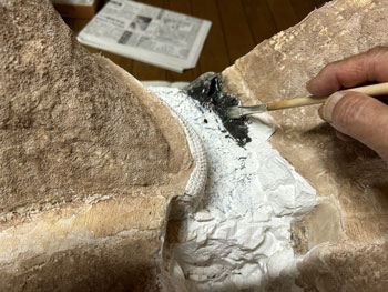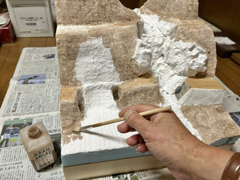 ![]() ![]() 橋脚が所定の位置・高さで収まるようにマイナスドライバーを使って石膏・紙粘土を削り、これで良しとなったら橋脚をそのままの状態で橋を接着します。 次は崖崩れの部分に霧吹きで水を吹き付けてから茶こしで石膏を撒いて地面を粗くしておきます。 ![]() と同時に、岩肌を石膏で作ったときの残りをハンマーで砕き、更に茶こしで粗目のものを選び出して、デザートイエローの溶液に浸して着色。 これを新聞紙の上で乾燥させます。 ![]() さて、いよいよ地面の着色です(^_-)-☆。 定石通りに薄い色から塗って行きますが、まず最初はフラットアースの溶液を上の方から塗り始め、乾いたらもう一度ニュアンスをつけながら塗り重ねていきます。 次は土砂崩れの部分をデザートイエローの溶液で塗り、この部分の橋脚にも塗っておきます(^_-)。 ![]() 次は岩肌の部分にフラットブラックの溶液を塗るのですが、ちょっと塗ってみた感じで濃すぎることに気付き中止。 どうやら使ってる内にシンナーも蒸発するだろうし、残りも容器の1/3程度だったので濃かったようです。 残念ながらエナメル系のシンナーの在庫はもうなかったので、明日、松本の模型店へ行って買ってきます(^O^)。 ということで塗装はここで中断してしまったので、別に塗っておいた土砂崩れの石を大雑把な大きさに分けておき、細かいものは木工ボンドの水溶液で上を中心に撒き、大き目のものは木工ボンドの原液で下の方に固定しておきました(^^♪。 |