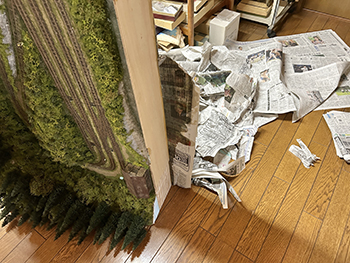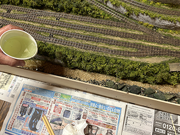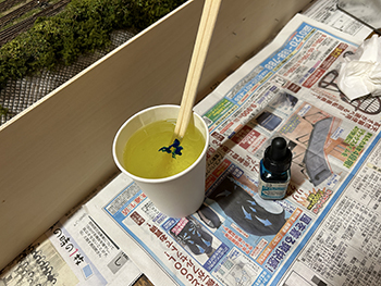 ![]() ![]() 今まで使っていた熱帯魚の水槽用フィルターは、もう20年前に濁川のモジュールを作る時に松本市の熱帯魚店で買ったものですが、ネットで検索をしたら安曇野市内にもお店があったので、早速買いに行ってみました(^-^)。 小さな切れ端を持っていき「これと同じものを下さい」と云ったら、「水槽の大きさはどれぐらいですか?」というので、かくかくしかじかの使い方をするんですと説明したら店員は驚いていました(^O^)。 一番小さなものを買ったのですが、来世でも使えそうな量ですね(爆)。 さて、いよいよウグイ川にレジンを流し込みました(^-^)。 まず、主剤と硬化剤を混ぜて180ccにしたものにインクを2滴垂らして良く攪拌してから流し込み、2回目は色を付けずに流し込み。 その後で水槽用のフィルターを小さく千切りながら浸していきました。 ![]() そこいら辺から既にどこかから水漏れが始まっていて、何重にも敷いた新聞紙に漏れが(@_@。 ちょっと出掛ける用事があったので、11時前には出掛けて3時に帰ってきたら、殆ど干からびていました(^O^)。 ここでレジンを追加すると、生乾きのレジンと生のレジンで変な反応を示すのが怖いので、この状態で固まるのを待ってからレジンを追加するようにしてみます(^^♪。 そうすれば、どこか漏れの原因になっている箇所も固まって、これ以上は漏れることもないでしょうから(^-^)。 充分に目張りをしたつもりだったのですが、本当に針の孔からでもレジンは漏れ出しますから怖いです(^O^)。 ![]() 昨日の朝に流し込んだレジンの殆どがどこかから漏れ出してしまい、渇水状態になってしまったウグイ川。 流石に夏だけあって硬化時間も短くて、今朝見たら9割方固まっていたので、追加のレジンを流し込みました。 水漏れの原因となっていたどこかの隙間も、昨日のレジンで塞いでしまったはずですから、今度は不安要素は皆無(なはず)(^_-)-☆。 埋め込んだフィルターの上にまたフィルターを浸して水面のザワついた感じを出すので、どうしても流れが急で泡立った感じになってしまいますが、これは致し方ないところ。 この作業を見ていた女房から「あなたでも失敗することがあるのネ」と云われてしまいましたが、「それでもそれなりに纏めるのがプロよ」と負け惜しみ(^O^)。 ![]() ![]() 流石に真夏だけあって24時間でレジンは固まりました。 そこで床への漏れ対策として敷いていた新聞紙を処理。何せ湯水の如く(^O^)漏れてしまったので、もう大変(@_@。 新聞紙と漏れ止め用のガムテープ&ベニヤ板を剥がしてみて(ベニヤ板もしっかりとベースボードに固着していたのでもう大変)、どこから漏れていたのかが分かりました。 川とヤードの段差を形成するウレタンフォームの部分からは全く漏れていなくて、ひたすら前面のガムテープの部分から漏れていました。 原因を考えると、ガムテープを2重にずらして貼っていなかったのと、川底に小石を敷いたためにガムテープが密着していなかったようです。 とにかく大きなカッターだけではダメで、ノコギリまで持ち出して硬化したレジンを切り、ようやく接客用のテーブルに移動しました。 ![]() あとは外周の型紙を新聞紙で作り、いつもの木工屋さんにベニヤ板のミシン加工をお願いすればOKです(^^♪。 |