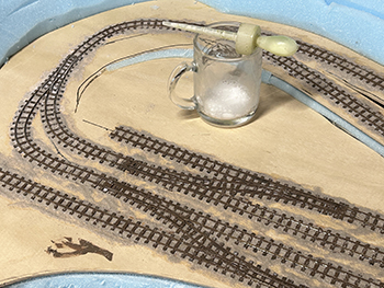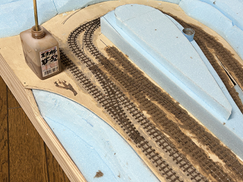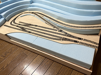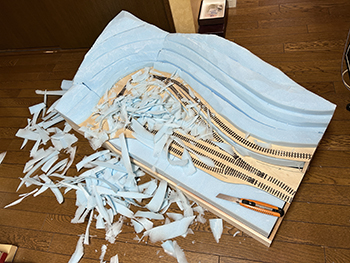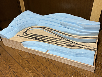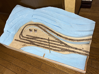 ![]() 大まかにウレタンフォームを大きなカッターで切り、木工ボンドで重ねて貼っていきます。 これの固着には時間が掛かるので他の仕事をしながら、頃合い良しと思ったところでカッターでザックザックと切っていきます。 ![]() 川の部分も形を整えたところで、線路(レール+枕木を線路、レール単体はレールと表現します)をフラットアースで塗っていきます。 ![]() ウレタンフォームの整形も済んだので、線路にバラストを撒き、木工ボンドの水溶液をスポイトで流しておきました。 イメージを膨らませてリバース線の内側にもウレタンフォームを切って貼り付けました。 線路が敷設される前は、裏山からウグイ川にかけては傾斜地だったと思われ、その名残がこの部分として残ってると想像しながら。 これでまた固着するまで放置プレイです(^-^)。 ![]() これが乾いたらまたフラットアースで塗っていきます。 リバース線の内側に積み重ねたウレタンフォームも加工できるような感じになったので、大きなカッターでザックザックと切削。 できるだけお団子状にならないように、起伏や窪地などを意識しながらつけて出来上がりました(^^♪。 |