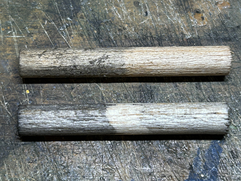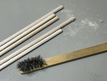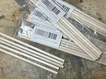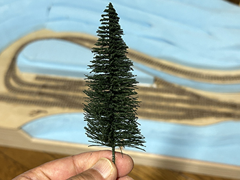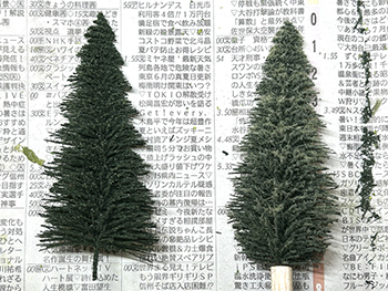 ![]() ![]() さて、工作が気の重い杉の木ですが、少しでもハッピーになれるように杉ではなく木曽桧ということにしましょうか(^O^)。 6箱買い込んだ桧の箱をひとつ開けて中身を出してみました。大きさは大小5種類あって、合計で41本入っていました。他の箱が同じ構成になってるかは分かりませんが(^O^)。 樹形じたいは割と気に入っているのですが(針葉樹というのは広葉樹と違って画一的な形をしているので、まあ、こんなものでしょう)、このままでは幹が短すぎるのと、ワイヤーブラシを捻ったような構造になっているので幹が貧弱なことから、Φ5mmのバルサ棒に差して使おうと思っています。 ![]() ただ、この大小をどのように配置するか、これはかなり悩みました。 色々と考えた結果、大雑把に云えば大きなものを手前に配置して、奥に行くにつれて順に背の低いものを植えようと思っています。 ただ、一番小さいのは全部使うかどうかは実際に植えてみての感じということで(^^♪。 改めて、桧というのはどのような樹形をしているのかをネットで調べてみました。 大雑把に云えば「水滴型」をしていて、製品のようにクリスマスツリーのような「三角錐」では決してない訳で、これをまず加工する必要があります。 あと前にも書きましたが、幹の下の方は枝のない部分が結構あるので、これはバルサ棒で接ぎ木をして。 葉っぱはスポンジの粉などでは針葉樹っぽくないので、尾小屋の情景で杉の木を植えた時のように、スタティックグラスをまぶせば、それらしくなりそうです。 とりあえず1本試作してみました(^-^)。 下の方の枝を水滴型にハサミでカットしてから、手元にある太いバルサ棒にドリルで穴を掘って製品の幹を差し込み、スプレー糊を吹きかけてから、スタティックグラスを振りかけて。 割とイイ感じになったと思いますが、如何でしょうか?(^O^)? ![]() アマゾンに注文しておいたΦ5mmのバルサ棒が届きました(^-^)。200mmの長さのものが25本。1本を4分割して使い、低い木には5分割したものを使います。 まず、長いままの状態でワイヤーブラシで綺麗に仕上げられた表面を荒らしていきますが、バルサには硬いのや柔らかいのがあり、硬い方はあまり傷つかないので目立たない所に使うようにします。 ![]() とりあえず1本差してみたの図(^O^)。 25本あるうちの5本だけは予備に残しておき、残り20本をひたすら糸鋸で切っていき、最初にΦ1.0mmドリルで、次に製品の幹の太さΦ1.8mmドリルで穴を明けていきます。 ![]() 幹に塗る前に試作をしてみました。 右上がフラットアースの溶液、左上がフラットアースとフラットブラックの混合溶液、右下がフラットブラックの薄い溶液、左下がフラットブラックの濃い溶液です。 試作の結果、フラットブラックの濃い溶液に原液を足して「もっと濃い溶液」で塗ることにしました。そして出来上がった第一号の木曽桧(^_-)-☆。 さてと、あとはひたすら同じことを何10回も繰り返していきます(^O^)。「きっとイイものが出来る!」と自分に云い聞かせて(^_-)-☆。 |
