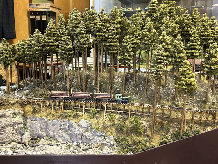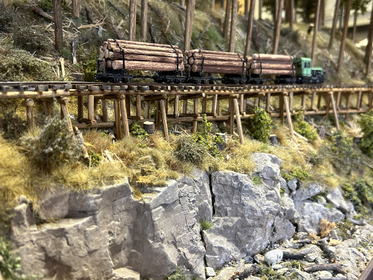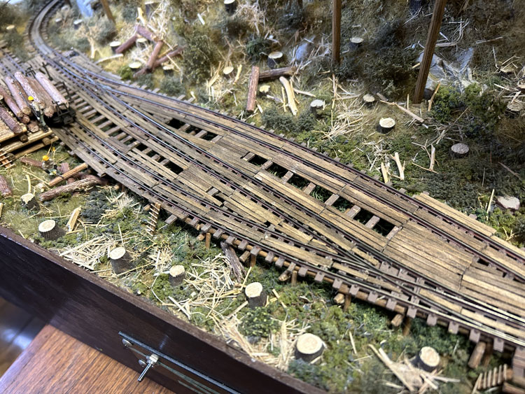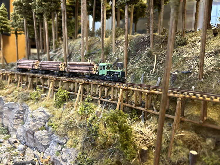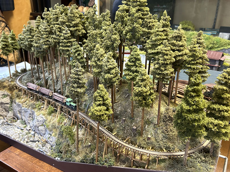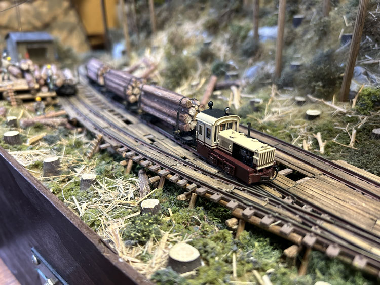 ![]() ![]() ![]() ![]() ![]() ![]() ![]() ![]() ![]() ![]() 2021/08/04 矢島さんが製品の引き取りがてら、組み上げた「森藤式大型集材機」を持ってきてくれました(^^♪。 これは下のレイアウトに組み込む予定だそうですが、ウェザリングが効果的でなかなかGoodです(*^^)v。 また新しく見つけたレイアウト素材を見せてくれたのですが、これも使えそうですね! っていうか、これを使うレイアウトを何か作りたくなってしまいました(^O^)。(もりこー) ![]() ![]() ![]() 2021/04/04 矢島さんが製品の引き取りがてら、いま製作中のレイアウトの写真を見せてくれました(^^♪。 大きさは850x450mmのエンドレスで、手前側が助六風伐採線のイメージ、向こう側が木橋になるそうです。 ベースは最後の写真のように一見フラットトップのように見えますが、実際には木組みで浮かしてあるため、スケスケになるその工作に苦労されたそうです。 しかし、こうやって形になると、その御苦労も吹っ飛んでしまうでしょうね(^^♪。 向こう側はどんな風になるか、樹木をどのように植えられるかが楽しみです(^_-)-☆。(もりこー) ![]() ![]() ![]() 2020/04/17 矢島さんが製品の引き取りがてら出来上がった車両を見せてくれました(^^♪。 助六の酒井製5tDL No.119を千頭塗装に仕上げたものと、木曽の酒井製7tDL No.137をアレンジしたもので、例によってデコーダーを積み込んであり、LEDのライトも組み込まれていますが、いつものように「墨入れ」と軽いウェザリングを施されています(^_-)-☆。 千頭の方は屋根上に乗せたエアータンクが印象的ですし、7tDLの方は少し濃いめのウェザリングが良い雰囲気を醸し出していました(^_-)。 台枠に入れたレタリングは短くカットした面相筆でドライブラシ的に色を差したそうですが、よくぞまあ「Aの三角部分」など色が入らなかったものと感心しました!(もりこー) ![]() ![]() ![]() 2017/08/27 矢島さんが製品の引き取りがてら出来上がった車両を見せてくれました(^^♪。 この問寒別の運輸工業製DLには例によってデコーダーを積み込んであり、LEDのライトも組み込まれていますが、いつものように「墨入れ」と軽いウェザリングを施されています(^_-)-☆。 控えめながらツボを押さえたテクニックはなかなかのもの。 客車の方はラッカーで塗装をしたあと、アクリル塗料を面相筆の先に僅かに含ませて、塗装面の上に乗せるようにしてサビを表現したとのこと。 実際に指の腹でなぞってみると、そのサビ具合が指に感じられました(^_-)。(もりこー) ![]() ![]() ![]() ![]() 2015/06/03 矢島さんが製品の引き取りがてら出来上がった車両を見せてくれました(^^♪。 この浜中の運輸工業製自走客車には例によってデコーダーを積み込んであり、LEDのライトも組み込まれていますが、いつものように「墨入れ」と軽いウェザリングを施されています(^_-)-☆。 もりこーが一番気に入った部分は、床下機器のうち通風ダクトのカラーリングで、この部分だけはライトグレーで塗られていました。 実車がそうであった、という事は判りませんが、モデルとして見た場合、これがひとつのアクセントになって「らしさ」を演出しているのが、センスの良さと唸らされたからです(^_-)。 「鶴居の釧路製製牽引客車は国鉄の10系客車のようにスマートだから」と、ウェザリングもアッサリと仕上げられていて、野暮ったい自走客車とは好対照をなしていました!(^^)!(もりこー) ![]() ![]() ![]() ![]() 2014/09/26 矢島さんが製品の引き取りがてら出来上がった車両を見せてくれました(^v^)。 釧路製8tDLUにはデコーダーを積み込んであり、例によってLEDのライトも組み込まれていますが、いつものように「墨入れ」と軽いウェザリングを施した車両は好感が持てます^\^)。 浜中のミルクカーUの木部はキサゲブラシで軽くスジを付け、そこに染み込んだ墨が立体感を増しています。 木部の朽ちさせ方とともに、片側に垂れ下げさせたチェーンも動きが感じられて、センスの良さが光っていますネ(^_-)。 標茶の運輸工業製牽引客車も、程好くサビを浮かせてあり、何処をどう汚せば良いかのツボを押さえてあるのは流石です!(^^)!(もりこー) ![]() ![]() ![]() 2014/07/16 矢島さんが製品の引き取りがてら出来上がった「歌登の単端U」を見せてくれました(^v^)。 デコーダーを積み込んであるのですが、例によってLEDのライトも組み込まれています。 「墨入れ」と軽いウェザリングを施した車両は「綺麗に汚れて」いて好感が持てるのですが、やはりこの作品の魅力はバス風のテールライト!(^^)! 内緒のハナシですが、4灯ある内の1個はドリルを折り込んでしまったそうで、やむなく内側の点灯は断念。 とはいえ、あの細いテールケースの中にLEDを組み込んだ根性は大したものです(^_-)-☆。 お茶を飲みながら話していたのですが、あのテールは何故4個もあったのか、本当に4ツ全部が点いていたのか。謎の帳の向こう側です・・・。(もりこー) ![]() ![]() ![]() 2013/09/11 続いて「魚梁瀬の野村組」。 塗装はMr.カラーのキャラクターイ