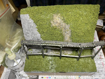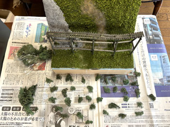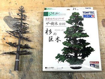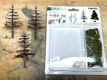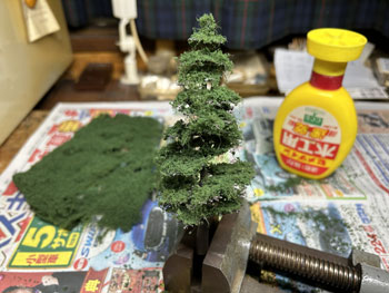 5月7日 ![]() 前日にコースターフを撒いて木工ボンドの水溶液で固定しておいたのですが、今日からは連休も明けて仕事の開始なので、夜になって作業を再開。 超ワンパターンの技法で、ライケンを木工ボンドの原液で適当に付けていくのですが、意外と使える部分というのは少なくて、枝みたいになってる部分は除去しながら小さく千切っておきます。 ![]() これがまだ乾かないうちで良いので、その上に木工ボンドの水溶液を筆で塗りながらスタティックグラスをパラパラと振り掛けていきます。 ![]() やはり木曽の情景ですから桧が欲しいところ。 針葉樹というのは広葉樹より何倍も雰囲気を出すのが難しくて、やたらオモチャっぽくなりがちです。 どうやって作ろうかな〜と散々悩んだ末に、Nゲージ用のトミー製の「杉の木」の幹+枝を使ってみる事にしました。 但し、付属している極彩色のスポンジは捨てて、暗緑色のフォーリッジを使って。 なお、枝の一番下は枝打ちをしておき、少しでも「らしく」してみて、そこはフラットブラウンにフラットブラックを混ぜたもので塗っておきました。。 ![]() この技法は初めての経験なので、まずは1本試しに作ってみたところ、なかなかイイ感じになり満足(*^^)v。 この感じであと6本作ってみました(^^♪。 5月8日 ![]() 翌朝になって出来上がった木曽桧は余分な糸くずをハサミで剪定してから、いよいよ植樹祭(^_-)-☆。 仮に手で持って「ここいら辺かな?」と探りを入れてから、思い切って太いドリルで地面の穴掘り。 めでたく7本全部の植樹を終えて、思わずまたナルった撮影を(^^♪。 う〜ん、イメージ通りの雰囲気に仕上がりました(*^^)v。 |