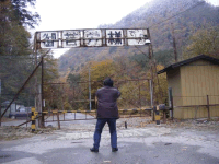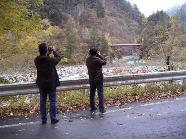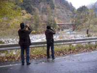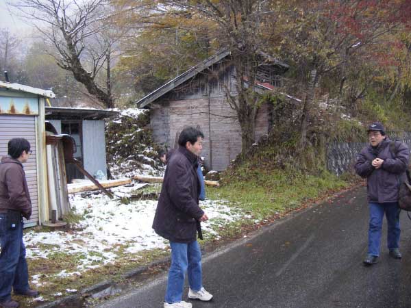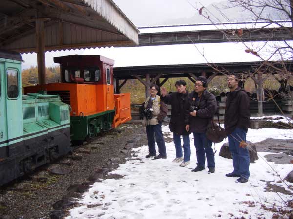 滝越部落に入るとまた雪がチラつき始めました。左端のカット中央は「やまばと号用機関車」の機関庫だったもの。みんな寒そうですねエ。工藤さんは何を撮っているのかな?山下さんが盛んに語っています。