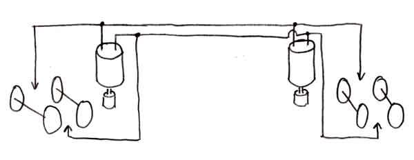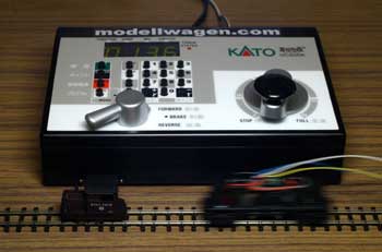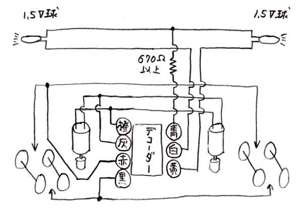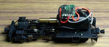 DCCには走行とは全く別にライトを点灯消灯させることが出来る機能も備わっています。ホイットコムよりもスペースに余裕のある10tボギーDLでは、そのライト点灯に挑戦をしてみることにしました。 しつこいようですが、全くの電気音痴のもりこーは、レールの右側の時に前進、という配線の基本も正直駄目なんです。プラスなんていうのは目に見えないモノなので(乾電池みたいに尖がっていれば、アッ、こっちがプラスなんだって判るんですが)、説明書を書くときには、上手くいった時の配線を見て、結線方向を解説しているんです、実は。上手くいくかなあ・・・ ![]() ![]() またまたKMC部内の掲示板にお尋ねです。今は上のように配線してあるものにデコーダーを積んだらどうなるんですか?と。そうしたら、電気の達人が教えてくれました。それが下の図です。正直言って、頭がクラクラ来ました。上の配線図だって目が眩むのに、その倍以上の配線ですよ、今度は。しかも、テーコーまで入ってる!!でも、そうとも言っておれません。ロートクールを目に差して取り組むことにしました。 ![]() まずやらなければならない事は、デコーダーを載せる場所の確保です。中央の大きなウエイトを糸ノコで5mm程カット。これが大変なんです。ウエイトを糸ノコで切った事がある方ならばお判りでしょうが、ねばる粘る。幸い塗装面を痛めることは無かったのですが、指の支えにしていた前のウエイトが外れてしまいました。 因みにこのDLはマシマ製モーターに換装してあります。このモーターは軸受が取付面から飛び出しているので、写真のように1mmのスペーサーを挟んであります。 ![]() まずはライト関係の配線はさておき、動力関係の配線をして、例によってデコーダーをプログラムしてみました。車番は136です。早速テスト走行。おーっ!!一発で上手く行きました。車番号1001のホイットコムは停めたままで、チャンと136が動きました。実はメンバーの誰もが2個モーターの動力車にデコーダーを積んだことがなかったので、不安だったんです。電気音痴ながらも、モーターが2個になると、抵抗値や電流値が違ってくるんじゃあないかとか(カッコ付けてこんなフレーズを使ってみましたが、この言葉もよく判っていないんです、実は)。でも、しずしずと動き出した時には嬉しかったですねえ。ホイットコムと同様に、15分ほどエンドレスをフルスピードで走らせてみましたが、モーターの異常発熱も無く、やれやれでした。これで長〜いKMCのエンドレスでも大丈夫そうです。 ![]() もう調子に乗って、正月に出来上がったばかりのBLWにも積み込んでしまいました。この時には、もう20年以上も前にPFMのサウンド装置で遊んでいた頃に買っといた、内径1mmの収縮チューブが配線に役立ちました。これもばっちしOK。車番は7です。IMONさんのこのモーターとのマッチングも、同様な走行テストの結果、特に問題は無さそうでした。 DLのヘッドライトに使用するゴマ粒球が無かったので、模型店に注文。それが届くまで作業はお預けです。そう、抵抗なんていうのも無いので、仲間に譲ってもらってネ。 |