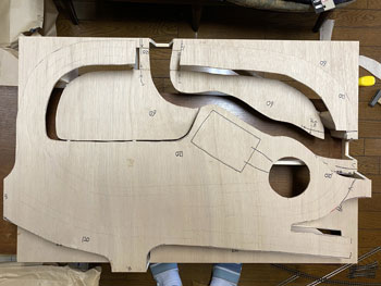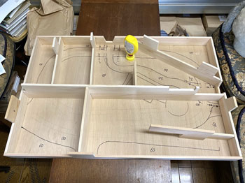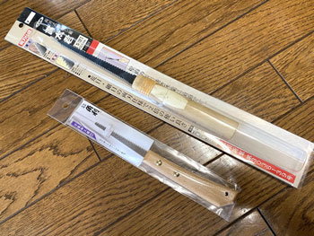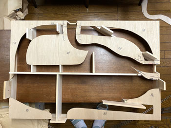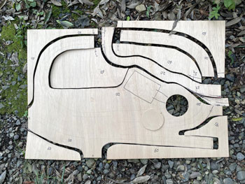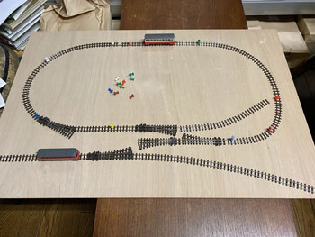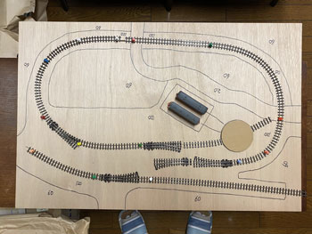 名無しのレイアウトというのもナニですから、一応考えてみたのが「春待町営軌道 上雪裡停留所」。 「春待(はるまち)」なんて何となく倉本 聰の「悲別」のようでチョット臭い感じもしましたが、早春の情景を作るんだからイイかな?と思って命名しました(^^♪。 「上雪裡(かみせつり)」というのは言わずもがな、鶴居村営軌道の「中雪裡」をもじったものです。 ![]() さて、名前もついたことだし、いよいよ制作に掛かります。 大きさはガラスケースに入る条件もあって910x600mmとしましたので、尾小屋のレイアウトよりも少し小振りです。 例によってホームセンターに行って4mm厚ベニヤ板と60x9mmの桧角材を購入。 今回はフラットトップ方式ではないので、引き回しノコが活躍するだろうと思い、新しいものを買ってきました 今まで使っていたものよりも刃の目が細かいものを見付けたので買ったのですが、どうしても引き回す時にノコを立てて切らざるをえないので、目が粗いと板がバタついてやりにくかったからです。 これで少しは作業が楽になるでしょう(^^♪。 ![]() ざっとレールをピンで止めてイメージを掴んでみましたが、最小半径は150Rです。 レール配置など、倉林さんのレイアウトのコピーなのですが、左手前には幌別町営軌道 音冬線 上茶呂停留所から「別海のタンクローリー積換施設」を移設するつもりです。 なかなか良く出来たこの施設は、元はKMCの畑中さんからプレゼントして頂いたものなので、3度目のお勤めです(^_-)-☆。 小判型に少し変化を加えて修正して、高低差を考えてみました。構内は120mmの標高にして、エンドレスの路盤も120mm。 地面の方を60mmと低くして情景に変化を出し、川の水面は20mmとしました。 ターンテーブルの大きさは自走客車がちょうど乗る直径100mm。 機関庫(というよりも翌朝に備えた駐泊所ですね)は2両の自走客車が何とか納まる大きさとして、川べりは石垣を積んで護岸工事をしておきますが、これはお手の物(*^^)v。 今までの経験から、川は護岸工事や川辺の傾斜などによって段々と狭まってしまうので、イメージよりも少し広くしておきました。 こんな事をやってたらワイフが作業を覗きこんで「あら、またレイアウトを作るんですか?」と。 何となく言外に「出来たら置き場所はどうするんですか?」というのを察知して、ただ単に「うん」とだけ返事をしておきました(@_@)。 メーカーとはいえ、ことレイアウトに関しては皆さんと同じなんですよ、ウチも(^O^)。 ![]() 仮止めしていたレールの位置に鉛筆で印をしておき撤去。 60x9mmの桧角材で標高120mmの所、60mmの所の土台をひたすら作りました。 引き回しノコは快調で、気持ちよく作業が出来ました(^_-)-☆。 ターンテーブルの丸穴はハンドドリルで咥えられる最大径6.5mmのドリルで穴を開けて、そこから引き回しノコで切り抜きました。 切断面を紙ヤスリで丁寧に仕上げて、いよいよ台枠に固定。 ![]() まず標高60mmの内で外側の部分を接着して、その後で内側のものも接着。次に標高120mmの部分を接着しました。 これが乾いたら裏返して川底の板を接着しますので、ちょっと休憩(^_-)。 ターンテーブルの部分を切り抜いた丸い物も捨てずにとっておき、底に利用します。 |