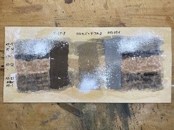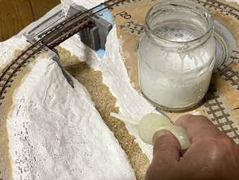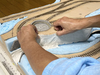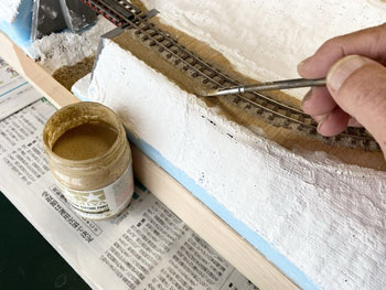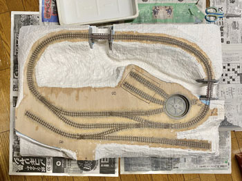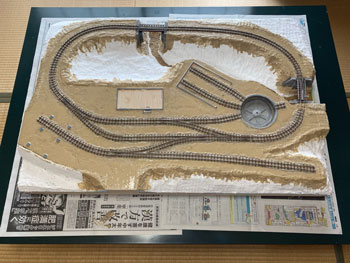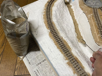 ![]() バラストもシッカリと固着していましたので、レールの側面やポイント部分に付着したものを除去して、更に分岐部の接点も磨いてもう一度テストラン。 これで大丈夫でしたので、いよいよ地面の下地を整えるべく作業をしました。 使ったのは毎度お馴染みのプラスタークロス。 ガーゼに石膏を塗ってあり、水に浸して天婦羅のように貼り付けていく方法です。 3種類ほどの大きさにハサミで切っておき、適宜使い分けていきますが、最初に貼りにくい部分から貼っていくのがコツです。 ![]() ![]() 1時間半ほどでその作業も終えて、すっかり地面は雪化粧になってしまいました(^O^)。 川底に砂を撒いて、木工ボンドの水溶液で固着しておきましたが、今回は緑の中の清流ではなく、寒々とした光景になりますので、敢えて明るいものにしようと思い、久しぶりに川砂を使いました。 これは熱帯魚の水槽に入れる砂ですが、ひと袋買ってこの時に使っただけなので、まだまだ残っています(^O^)。 今まででしたらこの段階でその他の部分にテクスチャーペイントを塗って、更にフラットアースで着色していくのですが、今回の設定は日陰に雪が残る早春。 何せ今回は早春の道東という初めてのシーズニングなので、ベニヤ板にプラスターを貼って3種類のテクスチャーペイントを塗ったものを用意して試作をしてみました。 道東は泥炭地帯が多くて、簡易軌道の沿線も殆どがこの土なので、何とかその雰囲気を再現したいと思っています。 写真の左側はダークアースのテクスチャーペイント、真ん中はライトサンドに少しダークアースを混ぜたテクスチャーペイント、右側はライトグレーのテクスチャーペイントです。 更に上から順に、XF-52 フラットアースにXF-1 フラットブラックを少し混ぜて薄めたもの、フラットアースのみ、フラットアースを塗ってからフラットブラックを塗ったものです。 テクスチャーペイントにも同様に着色していきましたが、ダークアースとライトグレーは元の色が強すぎて目立った違いはありませんでした。 因みにいつも使っているライトサンドのテクスチャーペイントは結果が分かっているので(何となく道東っぽくない土になる)試作はしませんでした。 こうやって試作をしてみると、プラスターの着色は一番上のもの(XF-52 フラットアースにXF-1 フラットブラックを少し混ぜて薄めたもの)が一番良いイメージで、何となく「雪が解けて地面の色が出て来つつある」ような感じがしますし、テクスチャーペイントの着色はフラットアースを塗ってからフラットブラックを塗ったものがプラスター部分と違和感がなくて良い感じです。 この結果を踏まえて、「プラスターの着色はXF-52 フラットアースにXF-1 フラットブラックを少し混ぜて薄めたもの」でやり、線路脇などは「ライトサンドに少しダークアースを混ぜたシーナリープラスターを塗りフラットアースを塗ってからフラットブラックを塗ったもの」(つまり左上と中下の組み合わせ)で仕上げてみます(^_-)。 ![]() 地面の仕上げに関して試作をしましたが、その結果を踏まえてプラスターで覆われていない部分にテクスチャーペイントを塗りました。 試作のようにライトサンドに僅かにダークアースを加えたものです。 ![]() 石膏を振り掛ける場合には茶こしを使いますが、これは意外と広範囲に撒いてしまうので、今回は網にマスキングテープを貼って、1cm角の穴を開けておきました。 これならばピンポイントで石膏を振り掛ける事が可能だと思ったからです(^_-)。 早速例の地面のテスト板に霧吹きで水を撒き、そこに茶こしで石膏を振り掛けていきました。 1cm角の穴にしたのですが、意外とピンポイントで撒くのは困難だという事が分かりました(^O^)。 その原因は茶こしの縁に付いた石膏が振り落とされるからで、本番ではスプーンを使って石膏を茶こしに入れて、振ることにしましょう(^^♪。 |