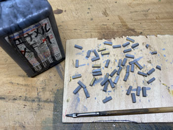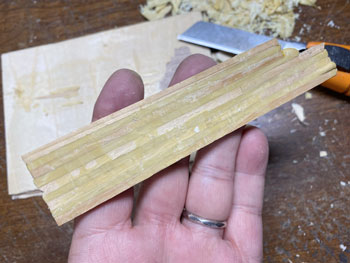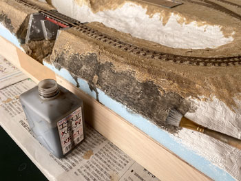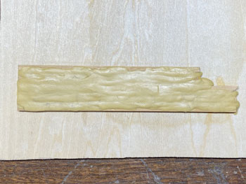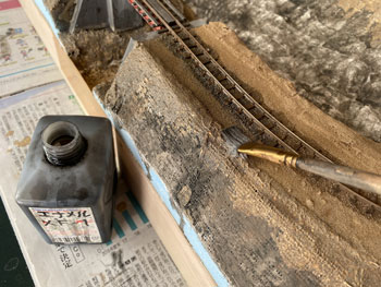 ![]() ![]() 試作の結果を踏まえて地面を塗装していきました。 まずはプラスターの部分をXF-52 フラットアースに僅かにXF-1 フラットブラックを加えたもので塗り、テクスチャーペイントを塗った部分とバラスト部分にXF-52 フラットアースを塗ってからXF-1 フラットブラックを塗りました。 石垣部分もフラットブラックで仕上げておきました。 これで関東ローム層から道東の泥炭地帯(釧路湿原に代表されるように、樹木などの葉が腐ってできた土で、スポンジのようにグチュグチュ)へ変身(^O^)。 ![]() 石垣の上にはやはり縁石が欲しくなって、少し手間でしたが少しだけ凝ったものを作りました(^_-)。 3mm角の縁石にしたかったのですが、3mm角の桧棒で作ろうかとか、どうやって作るか色々と暫く考えて、材料はエポキシパテで作る事にしました。 その作り方も大いに悩みました。 コネコネしたパテを3mm角の棒にするのも至難の業だろうし、考えたのが枠に押し込んでいく方法。 ベニヤ板に3mm角の桧棒を3mm間隔でチョン付けして、そこにこねたエポキシパテをぎゅうぎゅう押し込んで硬化を待ちます。 固まったところで余分なパテを削ぎ落し(これが予想以上に大変でした)、桧棒ごとベニヤ板からカッターで外します。 ![]() 今度はパテを桧棒から外すのですが、固まったとはいえ案外ホニャホニャだったので、これは意外と簡単に外せました。 外した状態って、何だかお酒のおつまみみたいですね(^O^)。この状態で放置すると固くなります。 ![]() ![]() これをグレーのテクスチャーペイントで塗り、乾いたところで10mmでカット。 切れ目にもグレーを塗ってからXF-1 フラットブラックで少し汚します。これで乾燥待ちひと晩。 これを石積みの上に貼り付けていったのですが、意外とイイ感じに仕上がりました(^^♪。 |