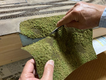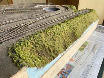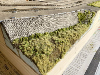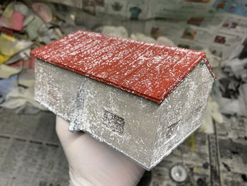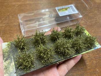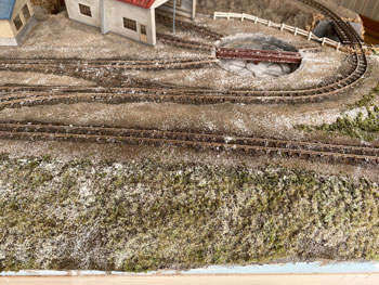 ![]() 小川に流し込んだレジンが固まるのを待つ間に一部の草撒きをしました(^^♪。 まず、基本的に季節は道東の早春。まだ寒いながらも段々と春の足音が近づき、日当たりの良い場所の草はいち早く色づいてきています。逆に日陰になった部分の雪は根雪のように残っています。 今回のレイアウトでは写真の下側を南、上側を北と設定しました。 やったのはその南側の草撒きで日当たりの良い方です。 ![]() ![]() 今回は新しい素材の「MARTIN WELBERG」の製品を初めて使ったのですが、写真で見る限りでは普通の「草の束をピンセットで摘まんで、そこに木工ボンドを付けて植え込んでいく」ものだと思った1種類が、いわゆる「草マット」だったんです。 通常「草マット」というのはBUSCHの製品で代表されるように「いかにも牧草地?」といった感じで敬遠してしまうのですが、これは全く違ってかなりリアル。 だったらこれをそのまま貼り付けてみようか、となった訳です(^_-)。 ゴム系接着剤でこれを貼り付けてから、余計な部分はカッターで切り取ります。 縁の部分はクッキリと「ここから草地」みたいになってしまいますので、そこはウッドランドのコースターフを木工ボンドの溶液で固着して境目をボカしておきました。 ![]() しかし、このままでは早春というよりも春、もしくは初夏の感じになってしまいますので、名残雪を降らせて北側との統一感を出すことにしました。 そこでベニヤ板の切れはしに例のマットとコースターフを、もう1枚のベニヤ板には北側に使う予定の草や下草を貼り付けて、霧吹きで水を撒き、穴を小さくした特製の茶こしを使って石膏を振り掛けて試作してみました。 おお! イイ感じじゃん(*^^)v ![]() これで自信が付いたので、これから南側に名残雪を降らして、春から早秋に衣替えしていきます(^_-)-☆。 南側半分に名残雪を降らせ終え、駐泊所と軌道事務所兼待合室の裏手には濃いめに雪を降らせておきました(^_-)。 ターンテーブルの中も忘れずに(^O^)。 ![]() 北側にも草を植えて、建物にも北側は強めに、南側は弱めに雪を少し被せておきましたが、一応、軌道事務所の煙突の周りはティッシュでマスキングをして降らさないようにしておきました(^_-)。 建物に降らせた雪は、ちょっと触ったら禿げたので、クリヤーラッカーを吹付てコーティングしておきました(^_-)-☆。 |