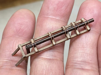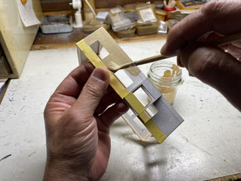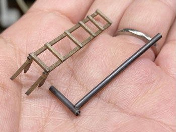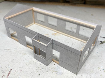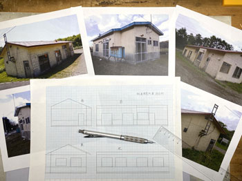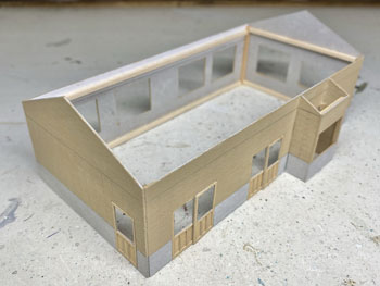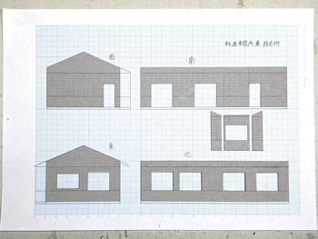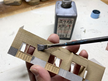 ![]() 鶴居村営軌道上幌呂停留所、標茶町営軌道沼幌停留所、浜中町営軌道秩父内停留所、別海町営軌道奥行臼停留所の軌道事務所の資料を集めてみました。 前者2つは恐らくブロック積構造の上に何かを塗ってあるのでしょうが、後者2つはブロック積みのままです。 また、上幌呂は土の凍結による被害を防ぐため、基礎部分が高いのが目に付きます。 いずれにしても内地の軌道(もしくは鉄道事務所)のイメージとは大きく違います。 これらを見ながらイメージを固めていき、図面を描いて製作に掛かりました(^_-)。大きさは140x70mmです。 ![]() 基本は奥行臼のものにプロトタイプをとり、上幌呂のように土の凍結による被害を防ぐため、基礎部分が高いものにして「北海道らしさ」を狙いました(^^♪。 側板の材料はいつものようにザラついたボール紙。下から10mmの部分に横一文字にカッターでラインを入れてから、ブロック積みらしく5x2.5mmでも切れ目を入れていきました。 2mmの桧角材で補強を入れながら箱状に組み立て。 ![]() ![]() 下の10mmの部分にはマスキングテープを貼り、ラッカー系のプラカラーでクリーム色に塗ってから、別にクリーム色に塗っておいたドアーを接着。 更に極く薄く溶いたXF-1 フラットブラックでウェザリングをしていき、カッターの切れ込み=ブロック積みを際立たせていきます。 この作業があるので、クリーム色は侵されないラッカー系のプラカラーで塗っておいた訳です(^_-)。 そしてウェザリングマスターの「マッド」で汚して、とりあえず完成(*^^)v。 ![]() 北海道の場合はこのように梯子状の補強枠がついている場合が多いので、今回ぜひやってみたかった部分で、1mm桧角棒でチョコチョコっと作ってみました。 煙突はφ2.0のパイプとφ2.0の丸棒の組み合わせですが、煙突掃除用の蓋の取っ手を付けてから黒染めしてみました(^_-)。 煙突と梯子状の保護枠をエポキシ系接着剤で接着しておき、これを縛ったような表現をしてみました(^^♪。 使った素材はφ0.2燐青銅線で、これをコンロでなましてヘロヘロにしておき、一端を梯子に接着してからグルグル巻きにして、もう一端も接着しました。 これを5回繰り返し、出来上がってみると結構良い出来栄えで、ナルってしまいます(^O^)。 ![]() 屋根は例のザラついたボール紙を使い、他の建物と変化を出そうと思い、5mmピッチで斜めに切れ目を入れていき、クロスさせていきました。 所定の寸法に切り出して、エナメル塗料のライトブルーで塗装。 それから例の煙突を穴に差し込んで固定したのですが、屋根にはもうひとつ宿舎スペース用の煙突が欲しいので、これも変化を出すために「お灸」のような土台を作りました。 素材はエポキシパテで、円錐形を斜めに傾げたように成型して、固まったところでφ2.0の穴を開けてからグレーのシーナリープラスターでコーティング。 更に屋根色に塗ってからφ2.0パイプの煙突を差し込んでおきましたが、シーナリープラスターを使ったことにより、ザラついて良い感じになりました(^^♪。 これで軌道事務所&待合所も完成しました(*^^)v。 |