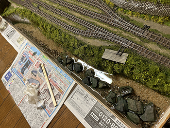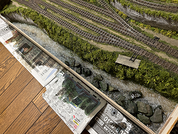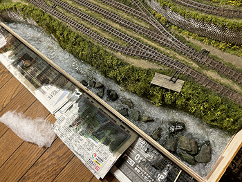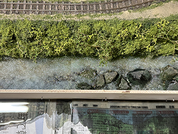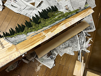 ![]() ![]() 今まで使っていた熱帯魚の水槽用フィルターは、もう20年前に濁川のモジュールを作る時に松本市の熱帯魚店で買ったものですが、ネットで検索をしたら安曇野市内にもお店があったので、早速買いに行ってみました(^-^)。 小さな切れ端を持っていき「これと同じものを下さい」と云ったら、「水槽の大きさはどれぐらいですか?」というので、かくかくしかじかの使い方をするんですと説明したら店員は驚いていました(^O^)。 一番小さなものを買ったのですが、来世でも使えそうな量ですね(爆)。 さて、いよいよウグイ川にレジンを流し込みました(^-^)。 まず、主剤と硬化剤を混ぜて180ccにしたものにインクを2滴垂らして良く攪拌してから流し込み、2回目は色を付けずに流し込み。 その後で水槽用のフィルターを小さく千切りながら浸していきました。 ![]() そこいら辺から既にどこかから水漏れが始まっていて、何重にも敷いた新聞紙に漏れが(@_@。 ちょっと出掛ける用事があったので、11時前には出掛けて3時に帰ってきたら、殆ど干からびていました(^O^)。 ここでレジンを追加すると、生乾きのレジンと生のレジンで変な反応を示すのが怖いので、この状態で固まるのを待ってからレジンを追加するようにしてみます(^^♪。 そうすれば、どこか漏れの原因になっている箇所も固まって、これ以上は漏れることもないでしょうから(^-^)。 充分に目張りをしたつもりだったのですが、本当に針の孔からでもレジンは漏れ出しますから怖いです(^O^)。 ![]() 昨日の朝に流し込んだレジンの殆どがどこかから漏れ出してしまい、渇水状態になってしまったウグイ川。 流石に夏だけあって硬化時間も短くて、今朝見たら9割方固まっていたので、追加のレジンを流し込みました。 水漏れの原因となっていたどこかの隙間も、昨日のレジンで塞いでしまったはずですから、今度は不安要素は皆無(なはず)(^_-)-☆。 埋め込んだフィルターの上にまたフィルターを浸して水面のザワついた感じを出すので、どうしても流れが急で泡立った感じになってしまいますが、これは致し方ないところ。 この作業を見ていた女房から「あなたでも失敗することがあるのネ」と云われてしまいましたが、「それでもそれなりに纏めるのがプロよ」と負け惜しみ(^O^)。 ![]() ![]() 流石に真夏だけあって24時間でレジンは固まりました。 そこで床への漏れ対策として敷いていた新聞紙を処理。何せ湯水の如く(^O^)漏れてしまったので、もう大変(@_@。 新聞紙と漏れ止め用のガムテープ&ベニヤ板を剥がしてみて(ベニヤ板もしっかりとベースボードに固着していたのでもう大変)、どこから漏れていたのかが分かりました。 川とヤードの段差を形成するウレタンフォームの部分からは全く漏れていなくて、ひたすら前面のガムテープの部分から漏れていました。 原因を考えると、ガムテープを2重にずらして貼っていなかったのと、川底に小石を敷いたためにガムテープが密着していなかったようです。 とにかく大きなカッターだけではダメで、ノコギリまで持ち出して硬化したレジンを切り、ようやく接客用のテーブルに移動しました。 ![]() あとは外周の型紙を新聞紙で作り、いつもの木工屋さんにベニヤ板のミシン加工をお願いすればOKです(^^♪。 |