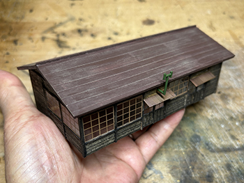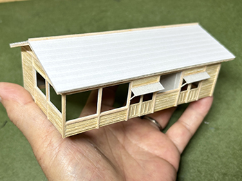 ![]() ここからはライケンが届かないと作業が進まないので、地面にテクスチャーペイントを撒くためにも、詰所を作ることにします(^-^)。 坊主岩停車場の詰所は遠望の写真しかなく、屋根は単純な切妻屋根とか、おおよその感じしか分かりません。 したがって普通の詰所だろうと推測して、大鹿ジャンクションの詰所を参考にしながら、設置条件に合う大きさで設計してみました(^-^)。 正面左側は休憩所、中央は簡単な台所、右側は物置という想定です。 昨夜のうちにボール紙を切り抜き細い柱を接着しておいたので、今朝は下見板を接着しました。 これを箱状に組んでいき、次は屋根板を作ります(^^♪。 ![]() 詰所を箱状に組んでいき、仮に設置場所に置いてみました(^^♪。 詰所の屋根は大鹿の詰所と同じように5mmピッチでラインを書いておいた所に6mm幅のコピー用紙を貼り付けて、四辺には1mm角棒を貼り付けて出来上がり、本体に接着。 ![]() これでコンクリート基礎の正確な寸法が出せるので、2mm厚バルサから切り出してボードに接着しました。 ライトグレーに塗れば地面にテクスチャーペイントを流し込める状況になりました(^^♪。 ![]() ウッドランドのスタティックグラスがもうじき無くなるので(もう20年近く前に買ったもの)、KATOのネットショップでまた買おうとしたら、同じものがもう売ってない(@_@。整品番号で調べてもダメでした。 そこで盛んに調べてみたら、聞きなれないメーカーものがあったので、試しにひとつ買ってみたら殆ど同様の(色具合も)でした(^_-)-☆。 もう少しこのメーカーの製品を見てみたら、細かい葉っぱや4cm位の灌木などもあったので、試しに一緒に買ってみました。 前者は結構イイ感じで、noch以外に少し色の変化を出すのに良い感じ(^-^)。 後者は塊になっていてほぐすのが大変そうですが、これまた変化をつけるのには良いかも知れません。 自分の定番だけではなく、たまには目をグルグル見まわしてみるのも良いですね(^O^)。 |