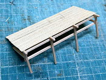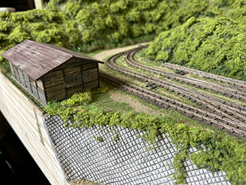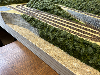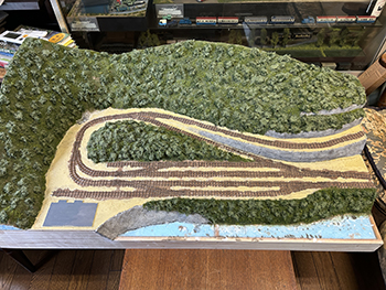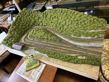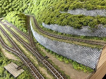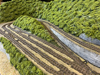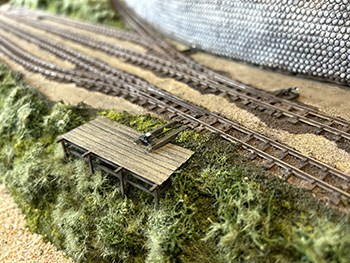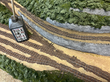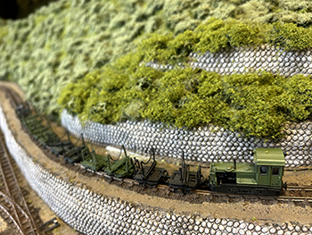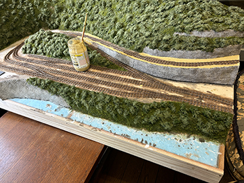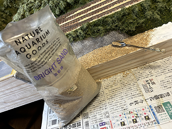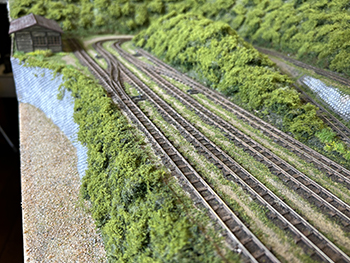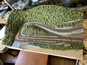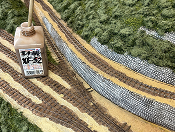 ![]() さて、地面の流し込みですが、上流から下流に流れてしまわないようにベースボードを傾けておき、ヘアーピンカーブで方向転換して助六へ向かう勾配線の部分の路肩にシーナリーペイントを流し、しばらく放置。 ようやくシーナリーペイントもほぼ固まったようなので、今度は逆向きに傾けてリバース線の下り勾配の部分にシーナリーペイントを流しておきましょう(^^♪。 ![]() そこで何となくウグイ川の渓流に川砂を撒きたくなったので、木工ボンドの原液を塗りつけて、いつもの熱帯魚の水槽用川砂を撒いておきました。 これまた固まるまで放置プレイ(^O^)。 ![]() 地面に撒いたシーナリーペイントが乾いたので着色を始めました。 最初はフラットアースの溶液で、それを乾かしては塗りを2回。 その乾く時間を使って、作っておいたポイント転轍器を塗ったり、川辺に張り出したポイント操作用のテラスを作ったりして(^-^)。 ![]() その後はフラットアースとフラットブラック混合溶液で。 フラットアースとフラットブラックの混合溶液を塗っては乾かし、塗っては乾かしを5回繰り返して地面の着色は完了。 ![]() 川辺に突き出したポイント操作用のデッキも設置し、塗り上げておいたポイント転轍器を9か所接着して、この辺りも完了(^_-)-☆。 次は繁茂した下草の上にフォーリッジを千切って接着していきます(^-^)。 ![]() 全山、灌木の植樹を終えました(^^♪。単純な作業で、ひたすら「忍」の一字でした(^O^)。 次は地面の雑草撒きです。 ![]() 詰所も固定して、雑草撒きも終わりました(^^♪。次は少し背の高い雑草を植えていきます(^-^)。 ![]() 少し背の高めの雑草はいつものようにマーティン・ウェルバーグのものを使用しましたが、色味が落ち着いているので好みです。 それを数種類、適材適所に使い分けて木工ボンドの原液で貼り付けていきました。 これからはレールを塗ることも汚すこともないので、頭を磨いてやったので生きた線路になりました(^-^)。 |