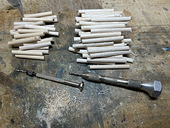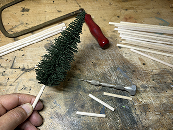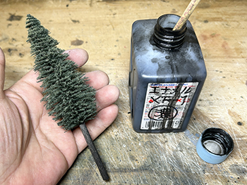 ![]() ![]() さて、工作が気の重い杉の木ですが、少しでもハッピーになれるように杉ではなく木曽桧ということにしましょうか(^O^)。 6箱買い込んだ桧の箱をひとつ開けて中身を出してみました。大きさは大小5種類あって、合計で41本入っていました。他の箱が同じ構成になってるかは分かりませんが(^O^)。 樹形じたいは割と気に入っているのですが(針葉樹というのは広葉樹と違って画一的な形をしているので、まあ、こんなものでしょう)、このままでは幹が短すぎるのと、ワイヤーブラシを捻ったような構造になっているので幹が貧弱なことから、Φ5mmのバルサ棒に差して使おうと思っています。 ![]() ただ、この大小をどのように配置するか、これはかなり悩みました。 色々と考えた結果、大雑把に云えば大きなものを手前に配置して、奥に行くにつれて順に背の低いものを植えようと思っています。 ただ、一番小さいのは全部使うかどうかは実際に植えてみての感じということで(^^♪。 改めて、桧というのはどのような樹形をしているのかをネットで調べてみました。 大雑把に云えば「水滴型」をしていて、製品のようにクリスマスツリーのような「三角錐」では決してない訳で、これをまず加工する必要があります。 あと前にも書きましたが、幹の下の方は枝のない部分が結構あるので、これはバルサ棒で接ぎ木をして。 葉っぱはスポンジの粉などでは針葉樹っぽくないので、尾小屋の情景で杉の木を植えた時のように、スタティックグラスをまぶせば、それらしくなりそうです。 とりあえず1本試作してみました(^-^)。 下の方の枝を水滴型にハサミでカットしてから、手元にある太いバルサ棒にドリルで穴を掘って製品の幹を差し込み、スプレー糊を吹きかけてから、スタティックグラスを振りかけて。 割とイイ感じになったと思いますが、如何でしょうか?(^O^)? ![]() アマゾンに注文しておいたΦ5mmのバルサ棒が届きました(^-^)。200mmの長さのものが25本。1本を4分割して使い、低い木には5分割したものを使います。 まず、長いままの状態でワイヤーブラシで綺麗に仕上げられた表面を荒らしていきますが、バルサには硬いのや柔らかいのがあり、硬い方はあまり傷つかないので目立たない所に使うようにします。 ![]() とりあえず1本差してみたの図(^O^)。 25本あるうちの5本だけは予備に残しておき、残り20本をひたすら糸鋸で切っていき、最初にΦ1.0mmドリルで、次に製品の幹の太さΦ1.8mmドリルで穴を明けていきます。 ![]() 幹に塗る前に試作をしてみました。 右上がフラットアースの溶液、左上がフラットアースとフラットブラックの混合溶液、右下がフラットブラックの薄い溶液、左下がフラットブラックの濃い溶液です。 試作の結果、フラットブラックの濃い溶液に原液を足して「もっと濃い溶液」で塗ることにしました。そして出来上がった第一号の木曽桧(^_-)-☆。 さてと、あとはひたすら同じことを何10回も繰り返していきます(^O^)。「きっとイイものが出来る!」と自分に云い聞かせて(^_-)-☆。 |