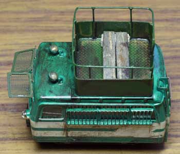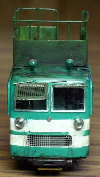 ![]() *題材:木曽の酒井製MC(初期型)、改造点:屋根上に探照灯およびバケットを設置。後妻面に昇降用 梯子設置。左右窓に保護枠設置。全面窓に跳ね上げ式保護枠設置。ラジエター開口部のメッシュ化。 *「ものがたり」 トンネル内、落石被い下などでは、冬季、湧水によるつららが形成される。つららの長さにより、背 の低い5t機には支障なくとも運材貨車あるいは人員輸送客車に支障が発生することがある。本線で は10t機のつらら切りで対応できるが、支線には入線できない。そのため、冬季における安全確保 を目的として高所作業車を機工課で作成した。また、トンネル、落石被い下のみならず、冬季、積雪 により生じる樹木枝葉の垂下による支障の対応、また夏季には台風被害として同様な樹木折損による 支障の対応などにも活躍している。なお、バケット作業中は転落防止のため安全帯を装着し、移動速 度は10km以下とするなど受傷事故防止対策としての運用上の規則が定められ、労基署の特認を受 けている。 *改造にあたり、トラックタイプの14号も候補に上がったが、作業場所までの人員輸送を考慮し、さ らには冬季作業の一時休息場所も確保できることから、ワゴン型のMCを改造するに至った。なお、 外部からはわからないが、バケット装着にあたり、屋根の一部補強および社内にロールバー様のパイ プフレームが追加されている。 *前面窓に保護枠を装着するとワイパーの使用が制限されるため、最近では保護枠無しでの作業もしば しば行われているようだ。また、照明追加による電装強化は当初バッテリーの容量UPで対応してい たが、長時間作業時には不足気味であるため。現在は本田技研製小型発動発電機を搭載し、作業電源 を確保している。この発電機は助手席後部車内に置かれており、排気は床下から外部へ導かれてい る。 *外部色は当初ダークグレー一色だったが、昨今、他省庁の作業車の例にみられるよう、塗色変更をし ている。建設省水防事務所、警察の救助工作車など他省庁の防災関係車輛を参考としたとの話を機工 課で聞いた。 ![]() ![]() ![]() ![]() 正直に申し上げて、最初に見たときに「汚いな〜」と思いましたが、それにも増して、実にユニークな発想がボクの琴線に触れてしまいました。今回、「酒井製モーターカーVとW」の発売直後だっただけに、これを題材とした作品が多数寄せられましたが、このような発想は予想だにしていませんでした。前回のV(というのも変ですが)を使いながら屋根上にテラスを設け、高所作業車に仕立ててしまう。しかもガラスはサファリパークの遊覧車のように防護柵で武装して。添えられた説明メモを読んでみて、なるほどと納得しましたが。ただ、もう少し丁寧に仕上げられていれば、特選間違い無しだったでしょう。 |