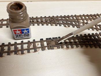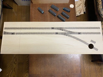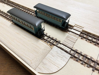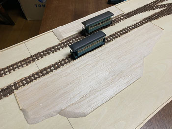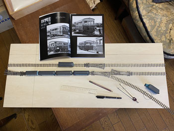 ![]() まず、昨夜のうちにレールの配置&位置を決めておき、2本の線路間は写真から推測して50mmに。 奥の線路の位置は向こう側にもホームがあることから、そのホームを目一杯の位置にセットするとして奥から65mmに。 車庫の脇にあるターンテーブルは、写真から推測して単端が目一杯乗る程度+αと見てφ45mmにしました。 ![]() それでホームセンター(東急ハンズを買収して一躍有名になったカインズホーム)の開店時間に合わせて行き、4mm厚のベニヤ板はあるので、いつも使っている60x9mmの桧角材を買い、帰宅後に作業開始。 ターンテーブルは引き回しノコで切ったのですが、φ45mmという急カーブにも関わらず前回買った引き回しノコは楽々切り抜く事が出来ました(^_-)。 そして目の字型に補強を入れた台枠も完成。 今回のレイアウトはフラットトップ型だし、建物も車庫と駅舎だけなので簡単に出来そうです(*^^)v。 台枠が出来上がったので、外周に土を流し込んだ時の土留めとなるような3x3mmの桧角材を貼って、線路の敷設を完了しました(^^♪。 ![]() ついでなので例によって例の如く、フラットアースで枕木+レールを塗っておきます。 ここいら辺の作業は十年一日の作法なので、書くのも恥ずかしいぐらい進歩がありません(^O^)。 次はバラスト撒きなのですが、今回は対向式ホームがあるので、それを作ってからになります。 プラットホームは5mm厚のバルサ板から切り出して、土留め部は1.5mm角に削り取って1.5mm角の桧棒を接着。 ![]() ![]() 渡り板の部分はその後からカットして階段状にしておきました(^^♪。 その渡り板は2mm厚のバルサ板を2mm幅に切り出して、角は爪で引っ掻いて落としておき、使い込んだように仕上げてからベースボードに接着。 レールの間は1mm厚のバルサ板を同様に仕上げておいてから接着。 バルサ板はこのように簡単に朽ちたような感じにできるので愛用しています(^_-)。 向こう側のホームの端はコンクリートにするように2mm厚のバルサ板を貼っておきました。 さ、明日はバラストを撒く事にしましょう(^_-)。 |