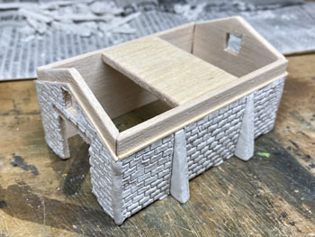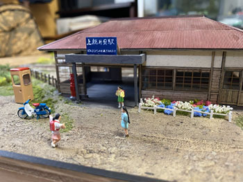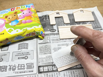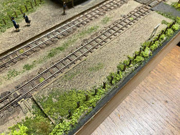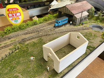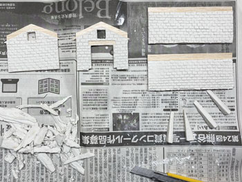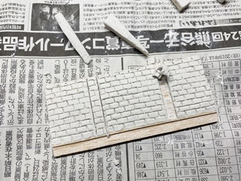 ![]() ![]() 柵は1.5mm角の桧棒をフラットブラックの溶液で染めてから切り、1cmピッチに穴を開けたところに植え込み。 柵の板は下見板を同様に染めてから1mm幅にカットして、それを柱スパンの長さに切って貼り付け。 接着剤が乾いたところでもう一度フラットブラックで染めておきました(^^♪。 ![]() 花壇も同様ですが、こちらの柱は1mm角の桧棒を柱に使用してフラットホワイトで塗装。 ラーメン屋の裏手の線路脇にも雑木を植えて、段々と賑やかになってきました(*^^)v。 さて、子供たちの遊び場の奥、ターンテーブルの手前の空地の活用法なのですが、昨日お風呂に入っていて思いついたのが農業倉庫をここに建てようというアイデア(^^♪。 沼尻・川桁駅のレイアウトで作ったもののような石積みのものですが、あれほど大きくはなくて小振りのものを考えています。 このレイアウト製作の目的は、あくまでも撮影の為の台ですから、カメラの邪魔になるようでは困りますから(^O^)。 床の大きさは100x60mmとして、仮にコピー用紙をその大きさを切って、レイアウトに置いてみて撮影の邪魔にならないかを確認してから製作を始めました。 ![]() 今日は一日中、農業倉庫の製作をしていました(^^♪。 製作方法は沼尻・川尻駅の農協倉庫と同じで、ただ小振りになっただけです。 高さも小振りになりますが、そうは云っても全高55mmありますから、それなりに立派です(^_-)。 ![]() ![]() 3mm厚のバルサ板を芯にして、そこに紙粘土を木工ボンドで貼りながら伸ばしていき、更に自作の金型で石積みを表現していきます。 両サイドの補強部分も小振りですから3mm厚にして、そこに紙ネンドを貼っておきました。 |