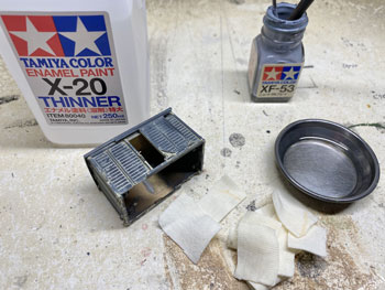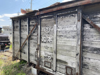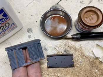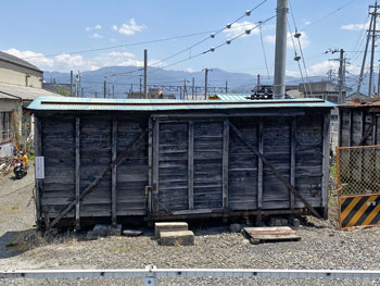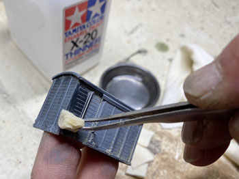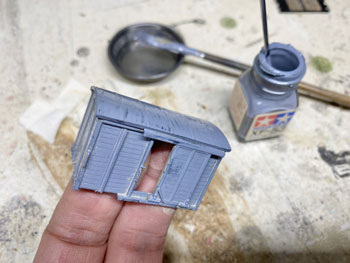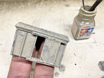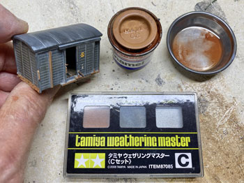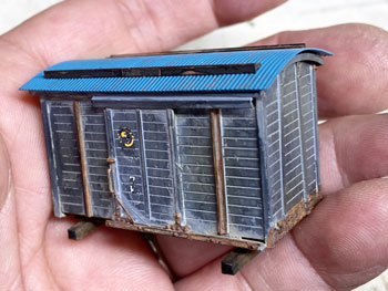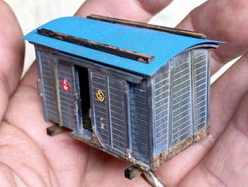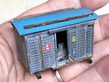 ![]() ![]() いささか建物作りにも嫌気が差してきたので(恐らくみなさんもでしょうが、当事者のボクはもっとです)、気分転換に「ダルマさん」を作る事にしました(^_-)-☆。 製品の残り部品を使って、床板から上で揃うものはないか?と物色していたら、「頸城のワ13」が何とかなりそうなので、これを組立開始。 ただ、片側の扉は少し開いた状態にして動きを出したかったので、ドアーストッパーの柱が一体で表現されている扉のその部分をカット。 代わりに側板の方に柱を作ってやり、テスリやロック装置を付けておきました。せめてこれぐらいはしないとネ(^^♪。 この製品の場合、朝顔カプラーは別部品を穴に差し込んで半田付けするようになっていたので、ちょうどお誂えむきです! STウッドを見える所だけに貼って、そこをマスキングして黒色に塗装。STウッドの部分はフラットブラック溶液で仕上げました。 ![]() ![]() ![]() このままではいくら何でもナニですから、実物を見に松本電鉄新村駅まで見学に行ってきました。ウチから約30分の距離です。 ときどきこの前は通るので、「あ、まだあるな」程度には認識していたのですが、まじまじと見るのは久しぶり。 社紋や「松本」のペンキ文字は薄れ、木の上に塗った塗料も剥げて地肌が露出し、鉄部は総て錆びて赤茶色になっています。 屋根の上には雨漏り対策でしょうか、波板が乗せられていて、その上に重しとなるレールやコンクリートの側溝などが置かれています。 イメージは掴んでいたのですが、やはり自分の目で見るというのは大切で、その感じを忘れないうちに作業を開始しました。 ![]() はてさて、あの感じをどうやって出すか。木と真鍮という材質の違いもありますし、総てそのままコピーという訳にはいきませんから、模型を見たときに「いいね」と思えるようにはしたものです(^_-)。 まず、全体をバフで塗りたくってしまい、それを小さく切ってシンナーを浸したボロ布で拭っていきます。 ![]() それが完全に乾いたところで今度はライトグレーを全体に塗り、同じようにシンナーで拭います。 どうせ拭ってしまうのだから何故バフを前に塗ったの?と思われるかも知れませんが、拭えない隅っこなどに微妙に残り、やはり違ってきますから。 ![]() そして錆びた鉄部はハンブロールの62番を原液のまま塗ります。 沼尻の旧社紋のレタリングを貼ってからシンナーを付けた面相筆でチョコチョコっとやって、レタリングを溶かして流れ落ちた感じにしておき、最後はウェザリングマスターでお化粧。 ![]() ![]() 屋根は沼尻ブルーを塗った波板を貼って、重しにはレールを乗せて、土台は2mm角の桧棒を付けて完成です。 僅かに開いた扉の間からオイルカンを見えるようにしてやると、グッと感じが良くなりました(*^^)v。 |