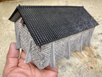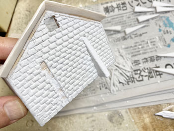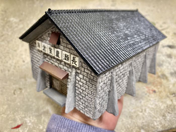 ![]() 意外と面倒なのが4辺にある補強部分ですが、これも3mm厚のバルサから所定の寸法に切り出しておきました。 はてさて、これにどうやって上手く紙粘土を貼るか、大いに悩みましたが、一遍に3辺に紙粘土を貼ると雑になるような気がしたので、1辺ずつ工作することにしました。 ![]() ![]() 瓦屋根の製作でして、素材は例によってエコーモデル製。 4面から屋根に向かって斜めに立ち上がる部分も仕上げておいて、屋根瓦の奥行というか斜めの部分の長さを正確に出してから、流石にこれほど大きな屋根になると2枚では足りないので、4枚を使って切り継ぎ。 裏打ちとして1mm厚のバルサ板を貼り付けて、しかも屋根の角度に合わせた補強板を8mm厚のバルサから3枚作っておきました。 この段階でレイアウトに土を撒いたときに困らないように、しかもこの倉庫は撮影のために取り外しできるようにしたいので、倉庫の内法にピッタリはまるような10mm厚のバルサを付けた土台を作ってレイアウトパネルに接着しておきました。 ここ頃になると斜めの補強部分は完全には乾いていないものの加工できるほどになっていたので、余分な部分をカットして、最後の断面部分に紙粘土を貼り付け。 斜めの補強部分に貼った紙粘土も乾いていたので、これを貼り付ける部分の紙粘土をカッターで除去しておいき、木工用瞬間接着剤で固定。 ![]() 塗装は当社のMWカラーのDL用グレーを薄く溶いたもので、これを何度も染めるようにして塗装。 屋根は光沢のある黒を塗り、瓦屋根特有の高級感を出しながら、僅かにタミヤのウェザリングマスターで汚してみました(^^♪。 ![]() ![]() そして画竜点睛の扉と通風窓やヒサシ、立派な看板を貼り付けて完成です(*^^)v。 こうやって出来上がってみると、石積みのLの字型をチマチマと押した紙粘土の苦労も、どこかにすっ飛んでしまいます(^O^)。 |