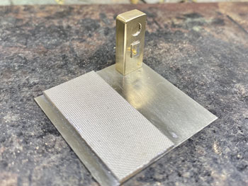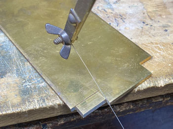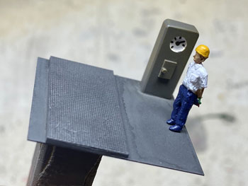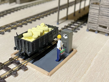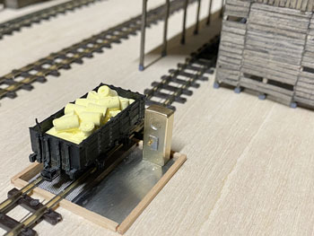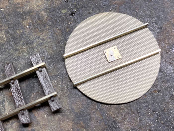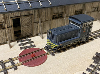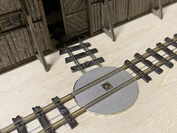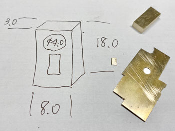 ![]() 計重台とは、積荷の硫黄を積んだ貨車の重さを測る装置で、「その重さー貨車の重さ=積荷の重さ」で正味重量を出すものです。 川桁駅にこれが設置されているのは判っているのですが、はてさてどのような形になってるのか写真が見当たらない! 見当たらなかったら、理に適ったものを作ればイイ訳で、このような感じで作ってみました(^^♪。 t0.3mmの網目板と1mmの真鍮板、0.3mmの板で写真のように作り、周りは1.5mmの角棒で保護するようにして、0.3mmの板の部分はコンクリを打った感じにします。 ![]() ![]() メーターボックスの素材は3mm厚と0.5mm厚の真鍮板。3mm厚の板なんて糸ノコで切るのは超久しぶりで、ノコ刃も0がつかない#3なんていう粗い刃を使ってザックザック(^^♪。 板から切り出した後は、寸法なんて殆どどうでもよいのに、ひたすら設計値と0.05mmも違わない直方体に仕上げ、そのあとでメーターとなる穴を明けておいた0.5mmの板を半田付けしてから点検蓋らしきものも付けて周りをRに仕上げ。 台にセットしてみると、我ながら悦に入ってしまいました(*^^)v。 ![]() 朝の内に全体をグレーに塗り、メーター部分には白を塗ってから所用で出掛けました。 夕方に帰ってから白く塗った部分に、いつも図面のトレースに使っているφ0.2のロットリングペンで目盛りと針を書き込み。 このインクは水性なので、何かの拍子に触って汚くなってしまうのを防ごうと、その上からクリヤーをサッと吹き付けておきました。 最後の最後に薄く溶いたフラットブラック、タミヤのウェザリングマスターでお化粧して出来上がり(^_-)。 コンクリにはLの字に曲げたφ0.4線を立てておいたので、人形の足にもφ0.4の穴を明けて立たせてやりました(^^♪。 ![]() このターンテーブルは上路式といってピットのない単純な形なので、工作は簡単です(^O^)。 まず、0.8mm厚の真鍮板にガソ101やDC12のホイールベースより僅かに長い30mmの丸をケガき、糸ノコで切り抜き。 裏側には半田メッキをしておき、0.3mm厚の網目板を貼り合わせて糸ノコで切り抜きます。 ![]() そして外周を丁寧にヤスリで仕上げてφ30の真円になるように仕上げます。 これだけだと寂しいので、センターには軸受を表現するために、四角く切った0.5mm厚の真鍮板を貼り、四隅にはφ0.5mm、センターにはφ0.8mmのピンを立ててみました(^^♪。 そして引き抜いたレールを正確に半田付け。 ![]() 仮にレイアウトの上に置いてみて、機関庫への線路を止めてから塗装に移りました。 MWプライマーで下塗りをしてからライトグレーで2回目の下塗りをして、3回目に赤を塗ってみました。 何色にしようかと考えたのですが、「ここを目印にチャンと乗せて方向転換しろよ」という意味合いで目立つ方が良いと思い、赤にしました(^_-)-☆。 但し、濃いめのウェザリングで汚して、あまり自己主張しないようにはしておきましたが(^O^)。 仮にレイアウトの上に置いてみて、う〜ん、これも自己満足してしまいますね〜(^^♪。 |