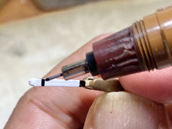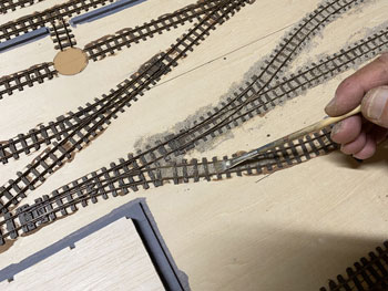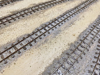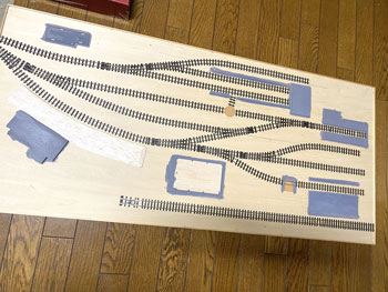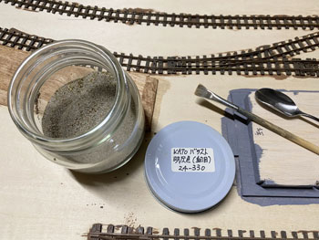 ![]() いよいよ地面の仕上げ作業に入ります。 ここからは毎度同じ作業なので、以前のレイアウト製作記と同じになりますが、流れとして一応書いておきます。 まず、建物のコンクリ土台を作ってグレーに塗っておきます。 これを作っておかないと、地面を仕上げた後で建物を建てることが出来なくなるので(実物と同じですね)(^O^)。 この段階でターンテーブルや測重台の部分をガムテープでマスキングしておきます。 その後で枕木&レールをフラットアースで原液のまま塗装します。 とにかくこのフラットアースという塗料は今後多用しますので、買いだめをしておきます(^_-)。 ![]() ![]() これが乾いたらバラスト撒きですが、ボクはいつもKATO製の明灰色細目というNゲージ用を愛用しています。 まず、小さなスプーンを万力で潰した専用のものでバラストを撒き、平筆で均していきます。 チマチマと10cmぐらいずつ進み、ようやくバラストを撒き終わったら固着作業です。 ![]() 用意するものは水を入れた霧吹き・木工ボンド水溶液・スポイトです。 霧吹きと木工ボンドの水溶液には僅かに中性洗剤を垂らしておき、浸透をよくします。 但し、あまりボンドを薄くしたり、洗剤を多く入れすぎると乾燥が遅くなってしまいますので要注意。 まず霧吹きで霧雨が降るような感じでバラストを濡らし、そこへスポイトに吸い上げた木工ボンドの水溶液を垂らしていきます。 中性洗剤のお蔭で気持ち良くボンドが浸透していくと思います。 ![]() この状態で明日の朝まで放置。 乾き待ちの時間を利用して、いずれ必要になる「ポイント限界標識」を作っておきました。 「ポイント限界標識」とは「ここから先に停めたら、別の分岐線から来た車両にぶつかってしまいますよ」という意味の標識で、Yの字の股の部分に設置します。 普通は地面からチョットだけ頭を出しているだけなのですが、流石に積雪地帯だけあって背が高いです(^^♪。 1.5mm角の桧棒を20mmにカットして、先の4面を斜めに切り落とし、下の5mmは丸く削って差し込み部としておきました。 エナメル系の白色を塗って乾いたところで、水性のロットリングペンで根元と上から僅か下を鉢巻状に黒く。 これも乾いたところでフラットクリヤーを吹き付けてオーバーコートしておきました(^_-)。 |