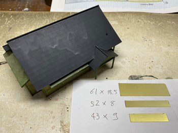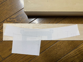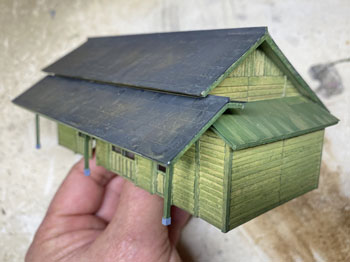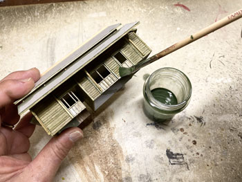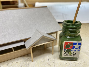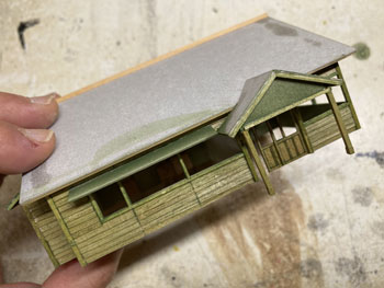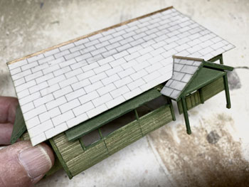 ![]() さて、仕上げの工程に入ります。 この駅舎はカラー写真を見るとモスグリーンに塗られていたようなので、タミヤのフラットグリーンをシンナーで極く極く薄く溶いたものを何回も何回も染めるように塗っていきます。 その何回もという作業なのですが、前に塗った塗料が乾かない内に塗ってしまうと塗り重ねにはなりませんので、必ず時間を置くこと、これが重要です(^_-)。 ![]() 屋根はボール紙を芯にして、その上に印画紙を貼り付けます。印画紙というのは薄いわりにシッカリしていて、裏側を使えば僅かにザラついた感じになっているので、ボクはよく使います。 その上に貼る印画紙にはカッターでスジ彫りをしておいたのですが、それは塗装をしたあとでないと全く目立ちません(^_-)。 ![]() 屋根は黒いのですが、単にフラットブラックを塗ったのでは妙味がないので、ラバーブラックを塗りました。本来は戦車の転輪のタイヤに塗る色です。 この段階で所定の大きさにカットしたエコーモデル製の波板を屋根やヒサシに貼り付けて、こちらはフラットグリーンに塗っておきます。 ようやくここに来て楽しめる部分になりました。看板の製作です(^^♪。 角材で四辺を囲んだボール紙の上に白い紙を貼り、そこにロットリングペンで文字を書き入れていくのですが、赤い文字だけは面相筆を使いました。 ![]() これにゲタを噛ませて、いつもロープ掛けなどに使っている絹糸で屋根に固定。 ここで全体に当社のウェザリンググレーで軽く汚しておき、更に屋根はタミヤのウェザリングマスターでニュアンスを付けていきました。 最後に窓ガラスをはめ込んで完成(*^^)v。 ![]() プラットホームも作っておきました。 このようなカーブした部分のRを正確に模写するのは難しいものですが、写真のようにコピー用紙をレールの上に置き、それを指でなぞるとレールの跡が付きます。 これをハサミで切っていけば型紙が出来る訳で、何のこっちゃない、簡単な作業です(^O^)。 プラットホームは写真から5mmと割り出して、例によってバルサ板から製作。そのバルサに型紙を糊で止めて、切り抜けば出来上がりです。 ![]() ホームには縁石ならぬ縁角材が付いていますので、1.5mm角棒を2cmピッチで糸ノコで切れ目を入れていき、軽くポキポキと折ってカーブに合わせます。 これを木工用瞬間で接着して、更に2cmのピッチごとに2本の支え棒を接着して出来上がり(^^♪。 |