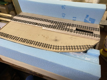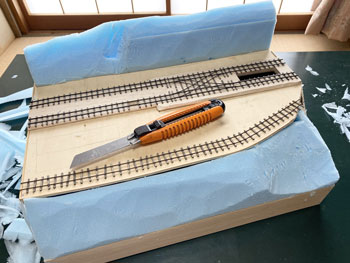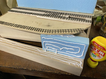 ![]() ![]() さて、ダブルクロスポイントの製作です(^^♪。 それに先立ち、素晴らしい助六のダブルΩループを製作した畑中さんに「マイクロ・エンジニアリング」の細いレールを使ってのポイント製作のアドバイスを頂きました。 彼からこのレールは黒メッキを剥がせば半田付けが可能だと聞き、それで大分光明が見えてきました(^_-)。 そこで考え出したのがt0.3の塩ビ板に両面テープを適宜貼り、レールを裏返して貼りながら半田付けしていくという方法。 とにかく今回は走らせられるようにする必要はないので気楽なものです(^_-)-☆。 写真のような段階を踏みながら6時間ほどで完成。 「これじゃ車輪のフランジが乗りあげちゃうよ!」 イイんです。走らせませんから(^O^)。 中性洗剤で洗ったあと、注意深く塩ビ板から剥がしてスパイクしてレイアウトに止めていきました。 ![]() 朝イチでウレタンフォームを刻んで木工ボンドで接着しました(^^♪。 これが乾くのには時間が掛かるので、今日は休みの日だし天気も良いので、近場にドライブにでも行って時間稼ぎをしてきます(^O^)。 ![]() ![]() いつもそうなのですが、レイアウトを作っているときというのは、周りの景色を見る目も違ってくるもので、建物の軒の作りとか、石垣の感じとか、やたら気になりだします(^O^)。 この時も乗鞍高原をドライブしていて目に留まったのが石垣。急停車して暫く観察してしまいました(^^♪。 そこで浮かんだアイデアというのは「ホッパー棟」の背後は石積みにしようということ。 帰宅したら何とか削れるまで固まっていましたので、そこは石積み用の直線にして、他はザックザックとカッターで削っていきました。 |