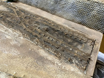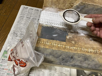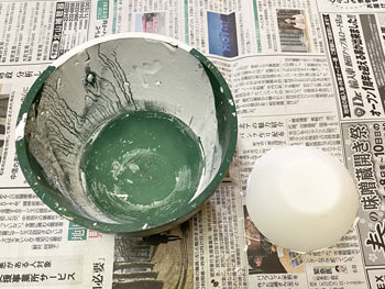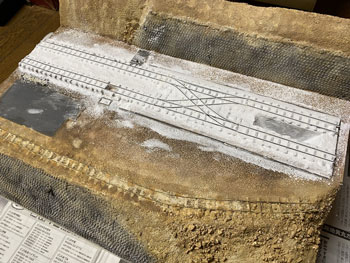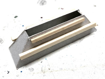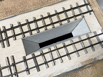![]() ホッパーはボール紙を組み合わせてこのように作りました(^^♪。そしてレイアウトに接着。 ![]() さて、いよいよ最後に残ったホッパー線への石膏の流し込みです。 例によって石膏を水で溶いたものを棒を使いながら流し込んでいき、半乾きのうちに茶こしで石膏を振り掛けて面を粗にします。 ここは手押しでトロッコを移動させる訳ではないので、枕木の中央部は踏み固めた感じにはしませんでした。 埋まってしまった「車輪洗浄装置」の排水口はマイナスのドライバーで穿り返し、土台のコンクリート部分に掛かってしまった石膏も除去し、レールの頭は爪で削ぎ取っておきます。 ![]() ![]() 石膏を水で溶くにはいつもこのようなゴム製のボールを使っていますが、これはもう40年来使い続けているもの。 ゴムで出来ているので、余った石膏を捨てる際にはチョット捻るだけでポロっと取れてしまい便利です。あとは新聞紙に包んで捨てるだけです(^_-)。 石膏も完全に固まり、フラットアースの溶液をまず塗ってから、フラットアース+フラットブラックの溶液やフラットブラックの溶液でニュアンスをつけていきました。 そして貯水タンクや、網目板で作って黒染めしておいた点検ハッチなどを固定。車輪洗浄装置水槽の内側にはコンクリートらしくグレーを塗っておきました。 ホッパー棟とズリ捨て線の間には、ちょっとした畑を作ることにして、枕木で四辺を囲った中に紙粘土の土を入れておきました(^_-)。 仮にホッパー棟や詰所を置いてみて、更にMr.KATOを置いてみるとグッと雰囲気が出て、思わずニンマリとしてしまう瞬間です(*^^)v。 |