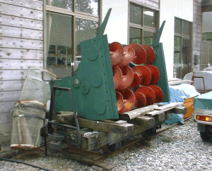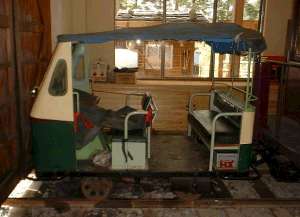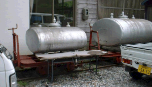 ![]() 貴賓車とその内部。同じような大きさのC型客車と比べると内装は雲泥の差。 ![]() 岩崎レール製モーターカー。自走しなくてもイイからHOナローで欲しいナ。 その2 さて、森林鉄道記念館を出ると、そのまわりには、様々な車輛が楽屋裏のような感じで置いてあります(つまり展示物然としているのは僅かで、大多数は放置してある、という感じです)。しかし、これまで各地で見てきた保存車とは違い、お膝元だけあって気配りがされている雰囲気は伝わってきます。 ![]() ジャーン。これが理髪車の実物です。残念ながら車内には入れませんが、窓越しに覗く事は出来ます。但し、保存にあたって台車は振り替えられてしまっています。車体の色もオリジナルでは、もっと赤かったようですが、色褪せちゃったのかナ? ![]() 隣りには酒井製5tが。この塗り分けは上松運輸営林署の色ですが、王滝営林署のそれは濃淡グリーンでした。これ、皆さんからよく頂く質問です。 ![]() こちらバックヤードストック。酒井製モーターカーや砂利運搬車などがあります。 ![]() 貴方なら、何を載せたいですか?僕だったら軽トラックとその荷台には番犬でも載せたいナ。台車が板バネ式のタイプですネ。普通は黒い台車ですが、こんな色も良いですネ。 ![]() 大小のタンクカーもあるでよ。こういう車輛もちゃんと作ると、結構イイんだろうなあ。 ![]() 寝覚の床にあったDLの片割れ。DL本体は寝覚の床に移されましたが、何故かロータリーヘッドだけは、ここに置き去りにされてしまいました。浜中のロータリーDLのヘッドが使える!と思いきや、結構かたちが違うんです。どうしよう。 その3 そういえば、まだカブースの採寸は今までしていなかったから、一応しとこうっと。あとDBTもちゃんと撮っておかなくちゃあネ。 ![]() 木曽を木曽らしく印象付けているのが、このカブースの存在。よく勘違いしている人がいますが、ボールドウィンなどの蒸機時代はエアーブレーキ化されていないので、カブースは存在していませんでした。いわば近代化(DL化)の象徴なのです。かなり色褪せて藤色になってしまっています。 ![]() カブースとともに近代化された木曽の象徴が、酒井DBTではないでしょうか。従来のボンネット側前位という既成概念を打ち破った"キャブフォワード発想"は、歴史に残る快挙だと僕は信じています。 赤沢をあとにした我々は、一路滝越を目指しました。 その目的は、松井大和氏に「滝越の雰囲気でジオラマを作って欲しい」という依頼をしているので、その資料集めの為でした。ところが大失敗。銀塩カメラでバシャバシャ撮影していたせいか、デジカメでは殆ど撮影していなかったのです(スミマセン)。 ![]() 滝越の構内はずれに、機関庫がそのまま残っていました。扉を開けると、まだレールすら敷かれたまま!まさに時間の流れが止まっていました。ここに王滝村有のDLが格納されていたんですよネ。滝越集落にたった一軒のお店・平沢デパートや様々な詰所も、当時のままでした。 ![]() 滝越からの帰り道、氷ケ瀬貯木場に寄ってみました。とはいっても、ここは昔の大鹿ジャンクションの跡です。夕暮れ時の広い構内は、雨に濡れたせいもあって、木の香りが漂っていました。 |