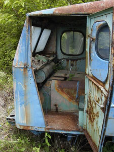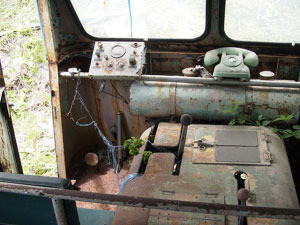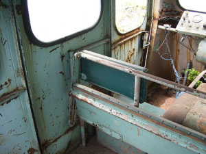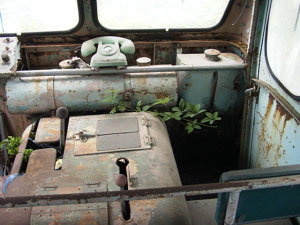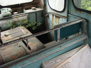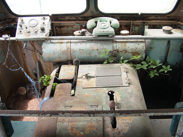 今度は車内を見ていきましょう。まず運転席と助手席との間にデーンとおわしますのはエンジンカバー。冬は暖かかったでしょうが、夏は辛かったでしょうね。無線用の電話機が目を引きます。隙間から忍び込んだ雑草が、そこはかとない諸行無常を感じさせます。