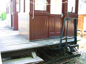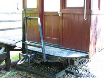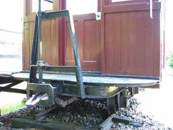![]() 台枠が楕円タンク車のものを利用しているのです。デッキともども展示にあたって工作されたような作りではなく、シッカリとしたもので、何らかの理由により木製の台枠を捨ててタンク車の物を利用したようです。従って、反ブレーキポスト側のポストはありません。カプラーのバネカバーもしっかりと原型を留めています。