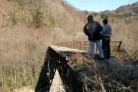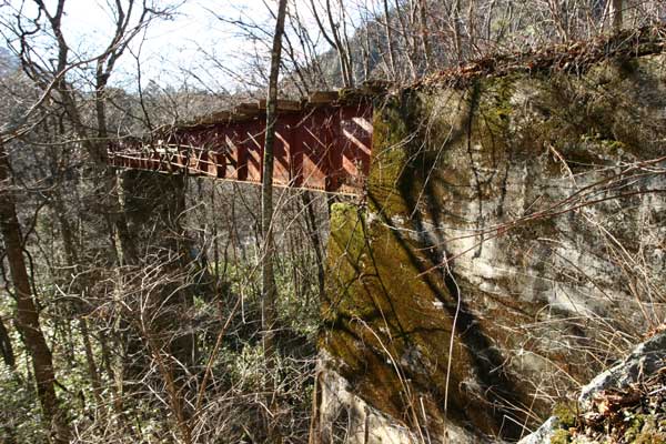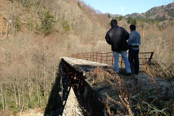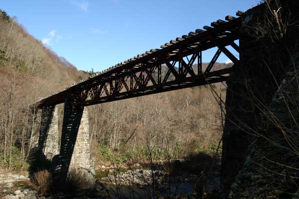 ![]() まずは滝越を目指しました。実は滝越には何度も行っていたにも係わらず、白川線の鉄橋は所在が判らず、今まで行ったことが無かったのです。しかし、最近航空写真のサイトを発見して線路跡が正確に判ったので、とにかく行ってみよう、とあいなった訳です。行ってみると、な〜んだ、こんな所だったのか!というような場所で、拍子抜けしてしまう程でした。線路は剥がされてはいるものの、橋梁そのものはシッカリしており、当時の面影もそのままです。因みにこの航空写真のサイトはKMCメンバーの中でも話題騒然で、一時はレイアウトも作らずにこの話題で持ちきりでした。