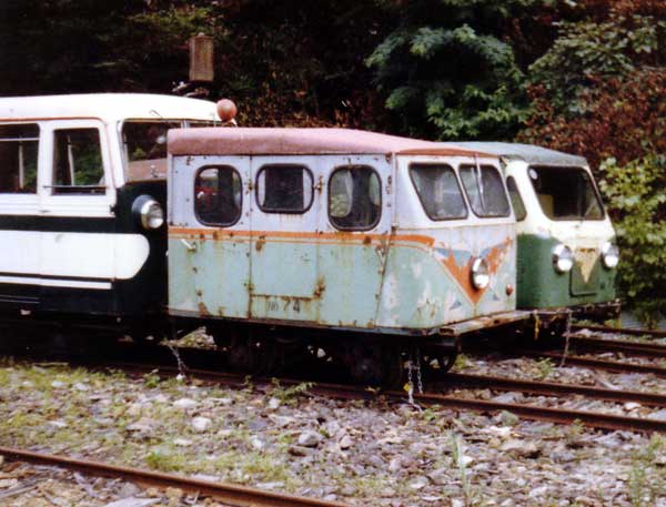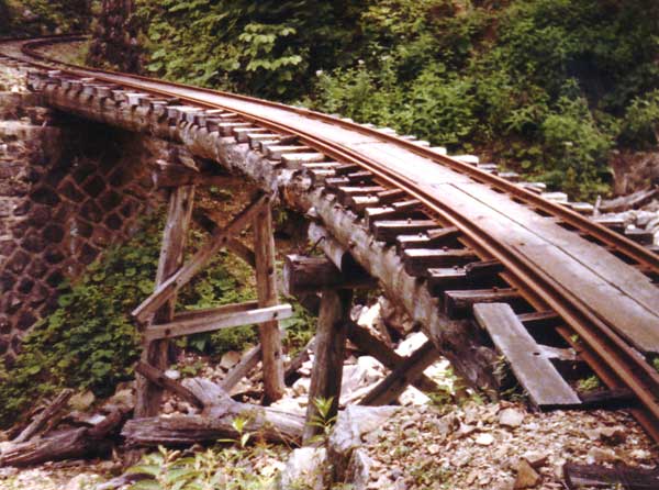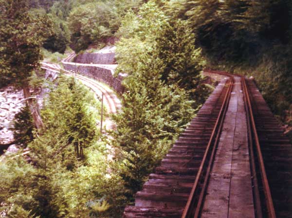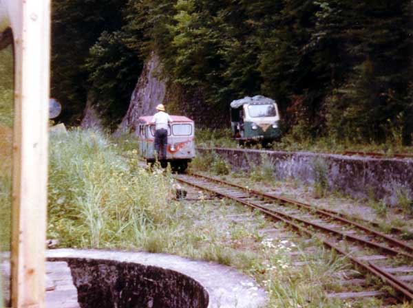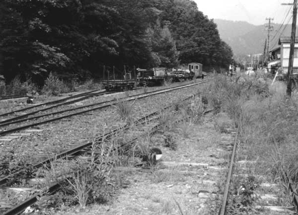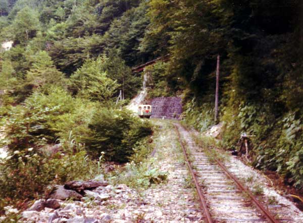 その2−3 2度目の訪問そして助六行き 助六から坊主岩まで軌道を戻りましたが途中、助六作業線分岐にあった平トロをまたもや無断借用し、坊主岩まで乗り下げ?ました。ところどころで撮影したのがカラーの写真です。 あとは河原に降りたりして下って来るのを待ちました。坊主岩には誰もいませんでした。最初にNo.74が下ってきて、自分たちの脇を止まらず下って行きました。次にNo.4が下ってきて、ピックアップしてくれ大鹿に戻った次第です。 モーターカーの中はエンジン音で会話も出来ないくらいでした。また、No.74は車内のエンジンカバーが外されていて、エンジンが剥き出しでした。エンジンはV型2気筒だったと思います。この日は大鹿から田島まで営林署の車で送ってもらってます。 翌日、土曜は民宿を出たのが8時すぎで、やはり大鹿まで歩いています。大鹿には岩崎モーターカーがおらず、「もっと早く着ていれば、また便乗できたのに」と悔やみつつ、軌道を歩き始めました。 黒淵まで来てお昼をとり、何枚か写真を撮ってから戻ったのですが、途中、岩崎モーターカーが下ってきました。しかもバックです。乗っていくかと声が掛かったのでありがたく大鹿まで便乗させてもらいました。バック運転でも下り勾配なので結構スピードが出ていたと思います。 あとは大鹿で適当に写真を撮って、こんどは田島まで帰りのバスに間に合うべくヘトヘトになりながらも歩いて戻りました。思えば荷物を民宿に預けるという発想がなく、全部持って移動していたのでかなり疲れた記憶があります。 ![]() ![]() ![]() ![]() ![]() ![]() ![]() ![]() ![]() ![]() ![]() |