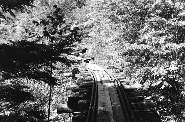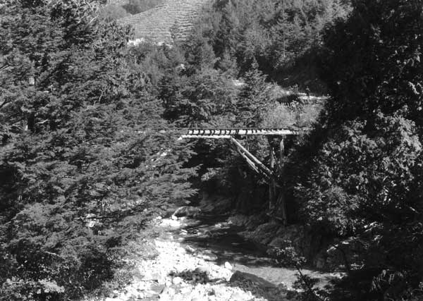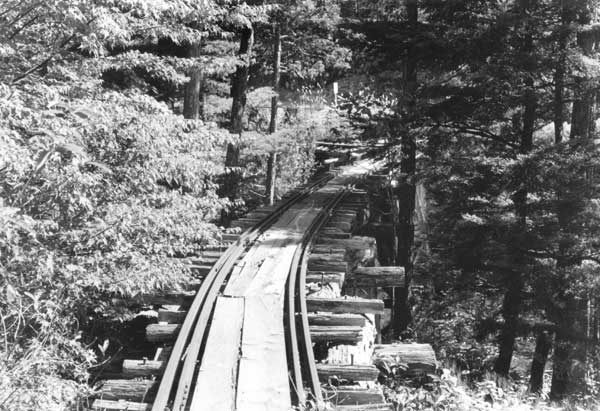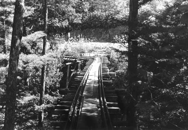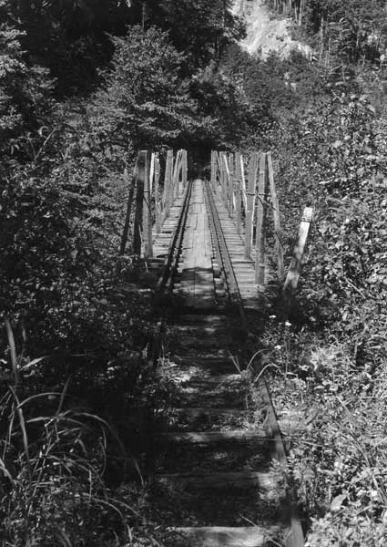 4回目の木曽行き 3回目の木曽行きで最後の稼働と思われる撤去作業を確かめた後、しばらくは木曽の情報も入ってこなかったのですが、85年、エコーモデルに寄ったとき、軽便礼賛10号が置いてありました。そこには、地震後に滝越を訪れたレポートとそのとき発見した小俣線のティンバーの写真がありました。 そもそも、小俣線についてはウグイ川線や王滝本線と較べると早い時期に廃止となっていたと思っており、またその稼働している写真も西さんの本にある黒淵の鉄橋を渡る1枚だけしか見ておらず、よもや簡単にアプローチ出来る場所に遺構があるとは思いもしませんでした。いわば盲点。 これは行くしかない!と思い、またまた友人と木曽に行くことにしました。このときは、オフロードバイクをキャラバンハイルーフに積み込み氷ヶ瀬で野営をしながら訪問です(自分は学生、友人は西武鉄道の社員でした)。もちろんメインは小俣線のティンバー捜索でしたが、三浦ダムまで遠征したり、瀬戸川線跡をトレースしたり、出来たばっかの赤沢記念館に行ったりしています。友人のキャラバンにバイク2台、自分は借り物のDT125、友人はXL250、を積み込み中央道を伊北まで。まだ長野道は出来ておらず、そこから一般道となります。たぶん(ここらへんから、記憶があいまい)着いた日はバイク降ろさなかったのかと... で、何日目に何をしたかが不明なのですがこんな具合です。 1)王滝営林署に通行許可(とういうか一方的通告?)のため立ち寄った。そのとき営林署発行の長野県西部地震のパンフと林道の詳しい地図のコピーを貰う。バイクでの通行は「気を付けて」とのこと。もっとも、地震で御岳林道が不通であり、滝越への生活道路を兼ねていたので問題なかったとも思います。当時、滝越へは、ウグイ川林道、小俣林道、白川林道というルートとなっていました。 2)上記3林道を辿りつつ、小俣線の遺構を探します。軽便礼賛の記事から、見つけるのは難しくないと思われたのですが、ついつい林道走行に夢中になってしまうので、そこは「今日は走りに来たんじゃない」と押さえつつ(笑)そのティンバーはかなり手前からわかりました。おー、あれじゃ!って感じで目に入って来たのを覚えています。 橋の前後は崩壊していました。写真の通りです。軽便礼賛のレポートでは、橋を渡らなかったそうですが、それは、頭のネジが何本か抜けている我ら!なんの躊躇もなく、渡り始めました。瀬戸川線のそれとは違い、見た目もかなりしっかりしているのと、以前ウグイ川線を訪問した経験もあったからだと思います。 いま思えばもう少しサイドからや取り付け部なども記録しておけばよかったと反省ですが、当時、模型制作の資料にしよう、と言う発想があまりなかったのですね。資料写真というより、情景写真となっています。 3)黒淵から坊主岩まで歩く。 翌日だったと思います。ウグイ川林道から黒淵へ降りるポイントがあり、そこから黒淵停車場を経て坊主岩まで歩きました。林道はかなり高いところを通っており、林道から軌道あとまで降りる斜面は徒歩道となっていました。といっても、木にテープでマーキングしてあるのと、踏み分けの跡、そして所々、木の階段って感じで、降りるのに15分くらいかかります。帰りの昇りはもっと大変。 軌道レベルまで降りるとそこは小俣線の軌道あと。レールも残ってます。そしてその先は黒淵の鉄橋。レールはそのままですが、手すりが出来ていました(写真の通りです)。 見覚えのある黒淵の事務所、むかしモーターカーで通ったときを思い出します。そこには、軽トラが1台。地震で取り残されたのか、それとも吊って渡したのか?キーは付いていたか思い出せません。軌道あとはレールが剥がされ林道化されていました。あとはテクテク歩くだけ。でも靴が・・・ブーツなんですね。まっ、林道走行するわけですから事故防止でもあり当然なんですけど。 坊主岩から先はレールを剥がしただけでところどころ枕木が残る軌道跡でした。特に橋の部分、たとえばヘアピンで折り返したあとドンドン高度を稼いで行くところのガーダーの部分とかは綺麗に枕木が残ってました。ただ、根性が無く、ここでストップ(今となっては残念)。ここでも写真撮っているんですけど、前述の通り行方不明(トホホ) 実は86年87年にも木曽には行ってます。目的は林鉄遺構探索ではなかったのですが、ちょっくら松原とか滝越とかに寄ったりしています。これは「学生二輪連盟」という団体がありまして、それのサマーキャンプがなんと王滝村なのですね。で、それに参加してたというわけです。東京からVT250Fで駆けつけるのです。もちろん、林道も走ります。普通の感覚だとロードスポーツ系のバイクで林道?なのですが、ちょっと経験をつめば下手なオフロードバイクより排気量のあるロードバイクの方が林道は速い!当時の仲間うちでは、特に軌道跡みたいな比較的コーナーの緩い林道の場合、750バ