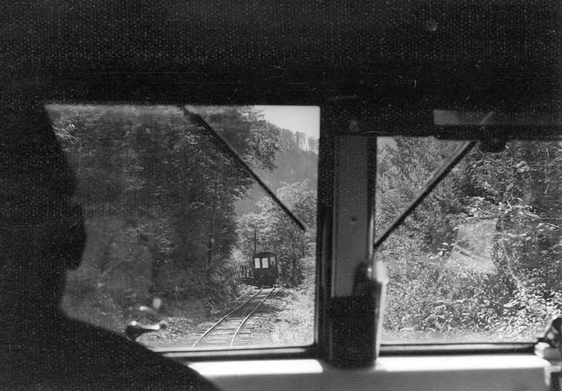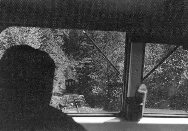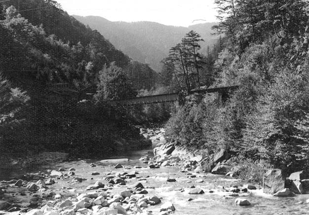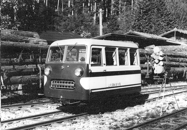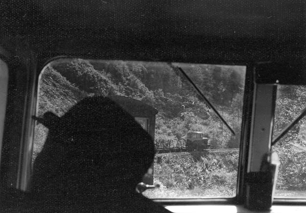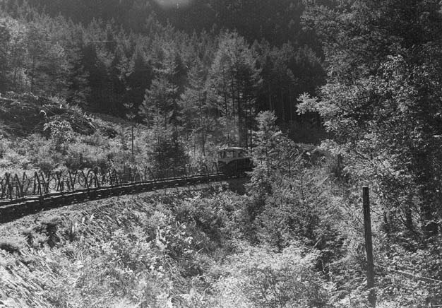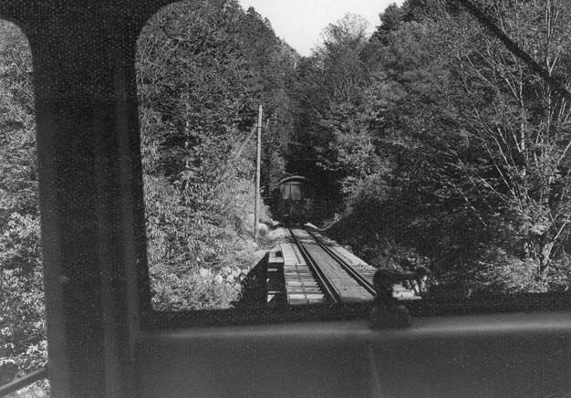 大鹿からはC4型キャブフォワードが牽引する運材台車の引き上げ列車に続行するかたちで、モーターカーNo.5に乗っての旅です。小俣線の鉄橋が見えてくれば、もうじき黒渕です。