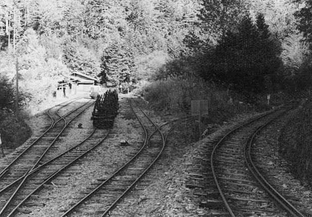 黒渕と後にしたモーターカーは更に山奥を目指します。特徴ある線路配置が見えてくれば、もう坊主岩です。ウグイ川線はここまでが一級線でC4キャブフォワードも入線可能ですが、ここから先は二級になるので、5tDLの独壇場となります。ここのヤードで運材列車の引渡しが行われます。