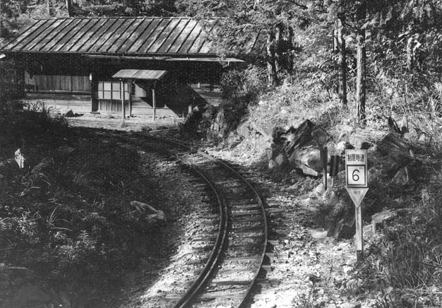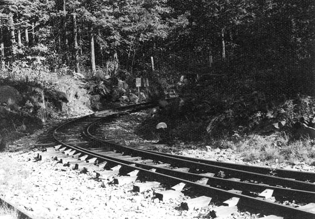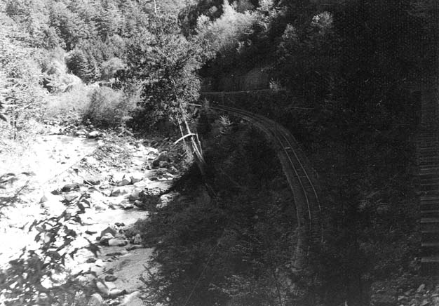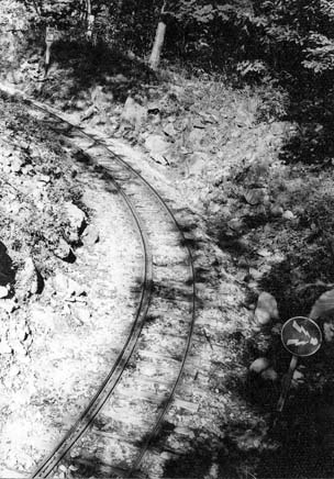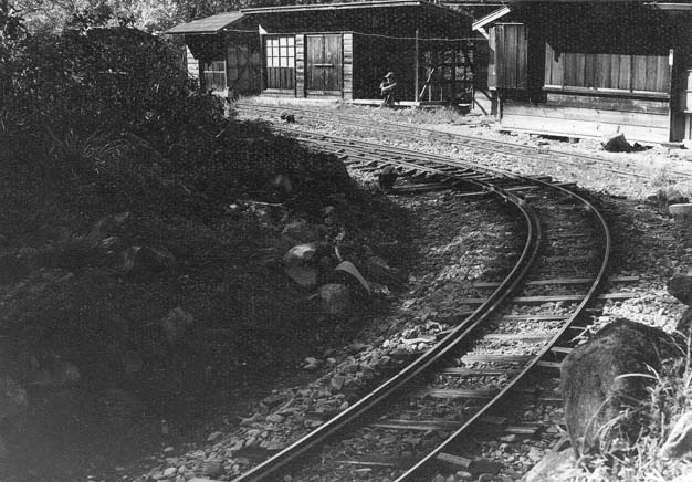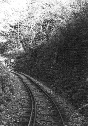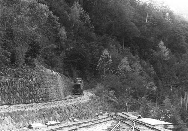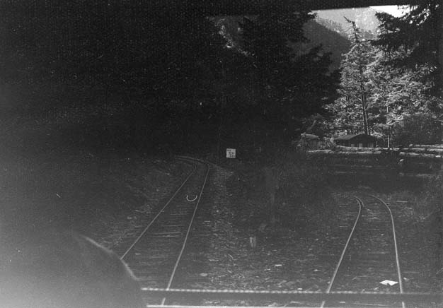 ここでユニークな坊主岩の線路配置を説明致しましょう。33.3パーミルの急勾配を登ってきた列車は、4線のヤードに入ります。ここで運材列車の引渡しが行われるのですが、その先は急なヘアーピンカーブになっていて(制限速度6km/h)、勾配を登りながら180度方向を転換します。また、この先はリバースにもなっていて、ヤードの手前に戻れるようにもなっています。一番下の写真は急勾配を登って行ったあとに、今来た線路を見下ろしたところです。僅かな距離でこれだけの高低差を稼いだことが判ります。