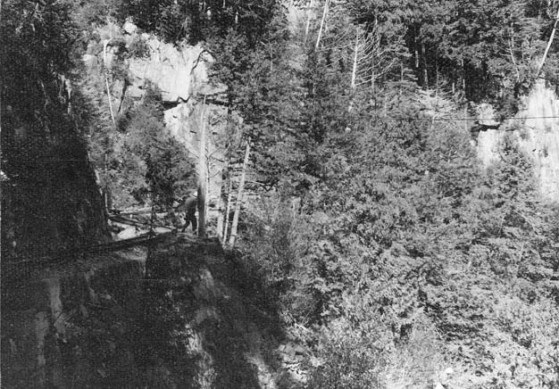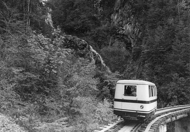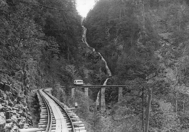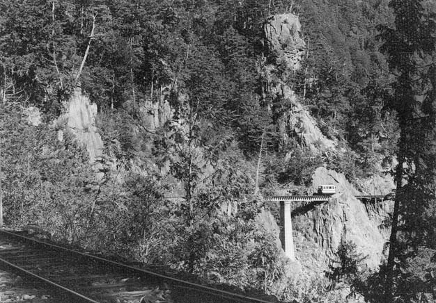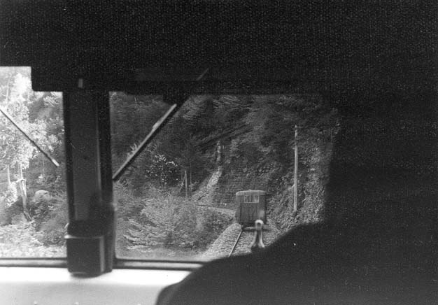 坊主岩からは小型モーターカーNo.69との続行運転です。軽快なエンジン音をあたりに響かせて、右に左にいくつものカーヴを巡って行くと、ウグイ川線有数の景勝地「樽ケ沢橋梁」に辿りつきます。