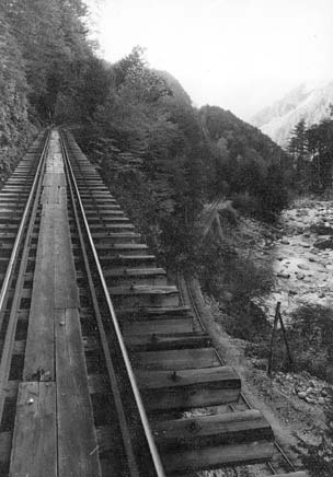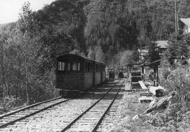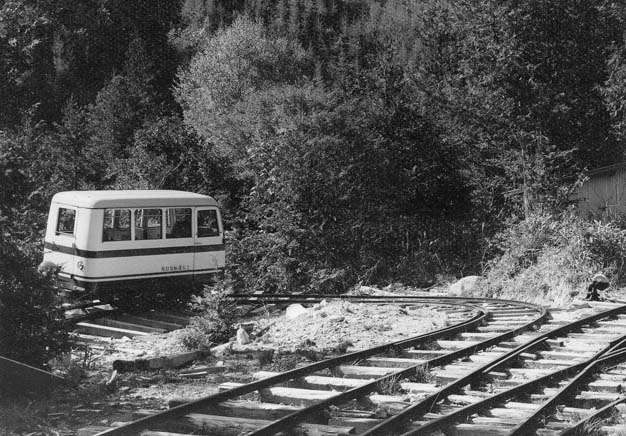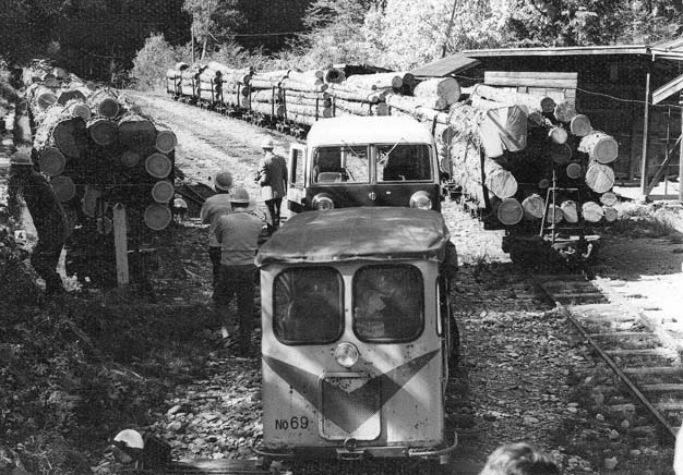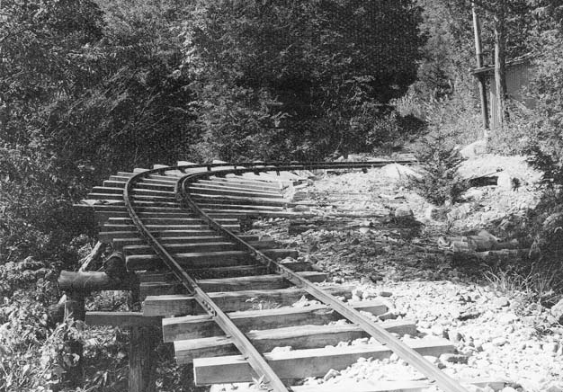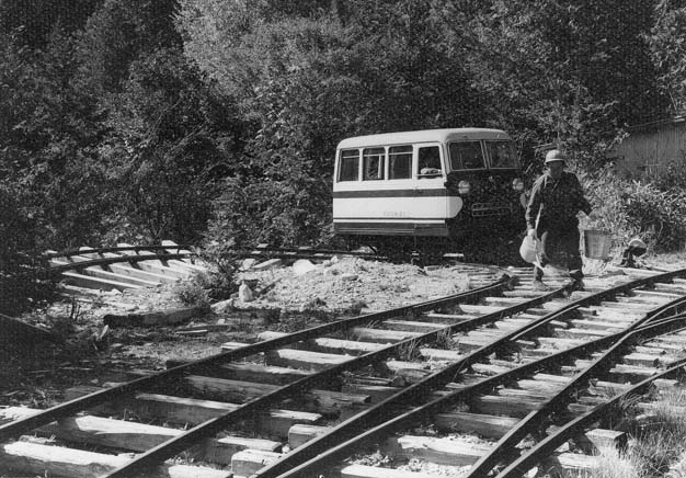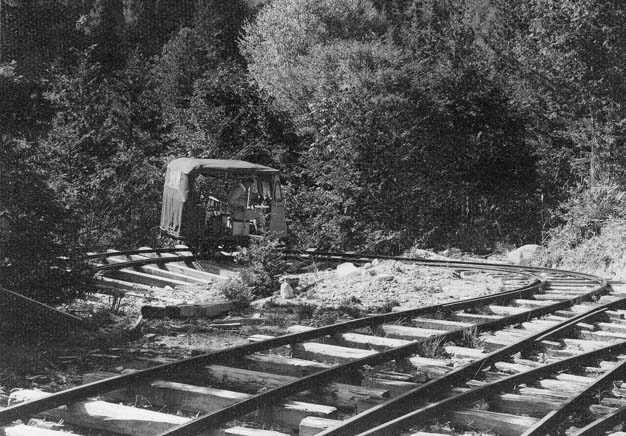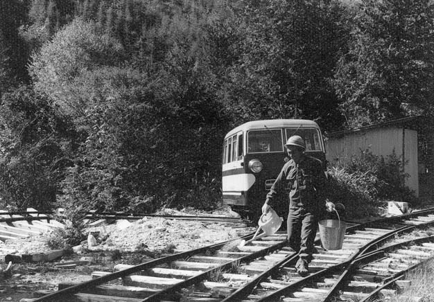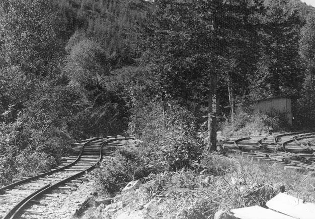 更に進んで行くと助六製品事業所に到着します。決して広くはない構内には合宿所や機関車駐泊所などがあり、その傍らにはモーターカー用のリバース線路があります。もの凄いカントが付いていますが、更に如雨露で水を撒いて車輪の摩擦を減らしながら、今乗ってきたモーターカーが方向転換していました。