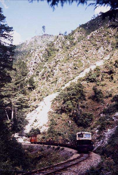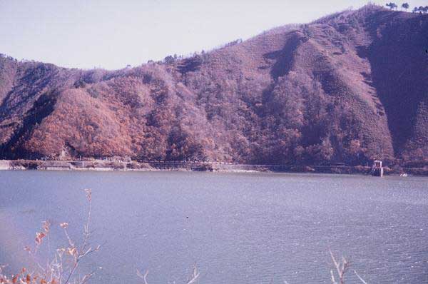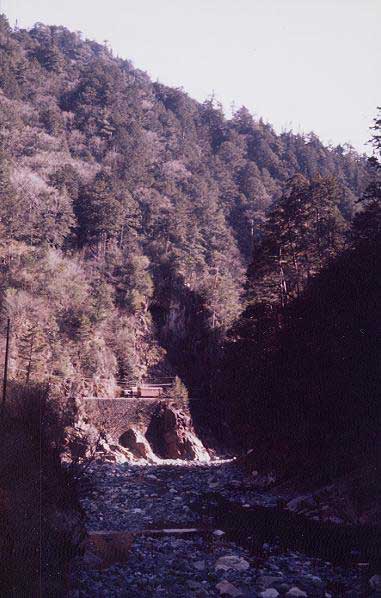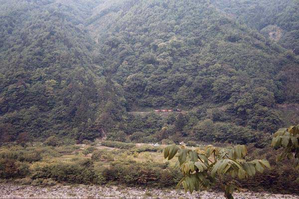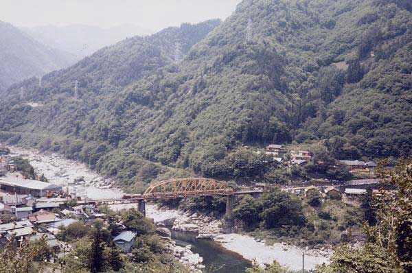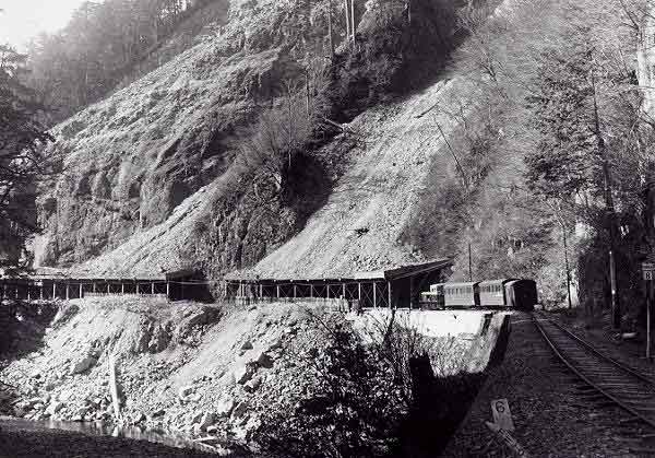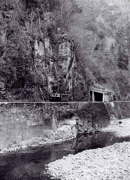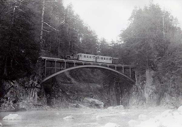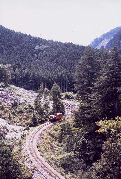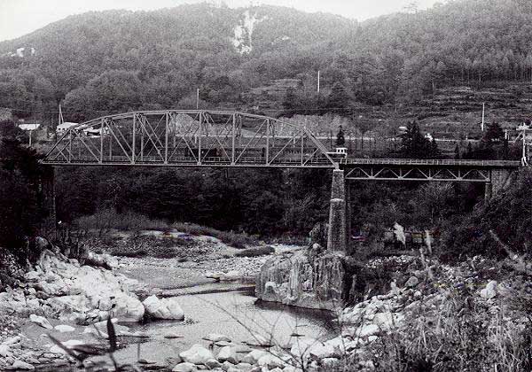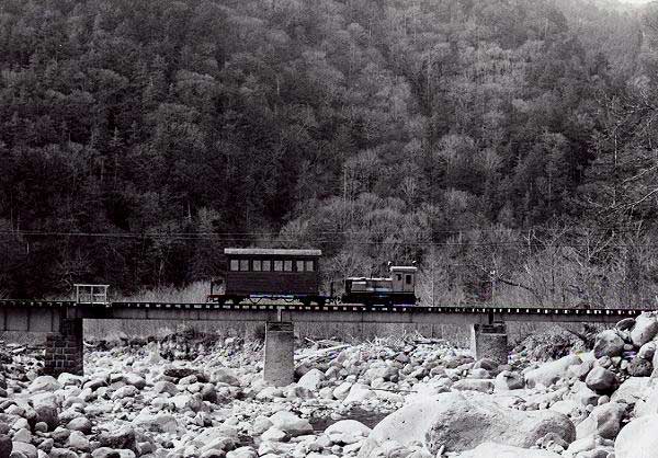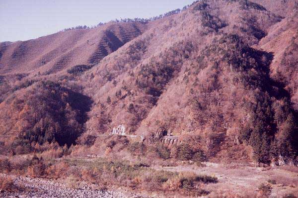 私は鉄道写真を模型の資料的に撮ることもあって、現在まで未だにモノクロ派なのですが、木曾森林鉄道については少しだけカラースライドでも撮影しています。今回は、皆さんがお待ちかねの木曾森林鉄道のカラー写真に、モノクロの走行写真を少し加えて計20枚を選定してみました。但し、モノクロの走行写真は数多く撮影しているので、全てお見せするとキリがありません。そこで「本当はカラーでお見せしかったのですが、露光条件やその他の事情でモノクロとなってしまった走行写真」と「編成的に興味があるもの」を少し混ぜてお見せすることにします。 走行写真についてですが、今更、撮影地ガイド的な話をしても仕方がないのですが、木曾森林鉄道王滝本線は平均して山の北側を走っているために撮影には悪条件でした。光線状態の良い所を列挙すると、小島付近の王滝川沿い、二子持付近の御岳湖沿い、氷ヶ瀬−下黒沢の日向淵、滝越−一ノ瀬間でした。もう一つ、終点本谷−土浦−堤防上間の三浦湖沿いはカナディアンロッキーのような素晴らしい風景なのですが、撮影の足場と現地へ行く足がほとんどないことと、撮影可能な列車本数が少ないため、ほとんど写真が発表されていないのが残念です。 ところで、今回のHPのために久々にカラースライドを保管箱から取り出したわけですが、経年により色調は変化し、ピントは甘くなり、カビにまで喰われていました。同じように保存しているモノクロのネガと比べると、カラースライドの方がカビに喰われやすく、また早くピントが甘くなっていくようです。ダイレクトプリントの時、色調の修正を依頼したのでサマになりましたが(修正するとダイレクトプリントの意味がない?)、甘くなったピントはどうしようもありません。このような駄作を皆様にお見せするのは「赤面もの」なのですが、王滝本線はカラーでの発表が少なく、シーナリーの製作などにも役立つと思われるので、恥を忍んで皆様にお見せする次第です。 ![]() @最初はやはり鬼淵の木曽川橋梁を渡る「みやま号」からです。2km程南の寝覚床から続く河原の美しさは現在も変わっていません。「みやま号」の上松行きは通常E型貨車が最後部になるのですが、この写真では途中でB型客車No.17を最後部に連結したのか、E型貨車が中間に挟まれていました。「編成的に興味があるもの」として選んだ一枚です。1974-11-14 ![]() A紅葉時に小島付近の王滝川沿いを行く「みやま号」。この場所は朝しか陽は当たりませんが、前後2km程が一望にできる上、道路上から安易に撮れる有名撮影地でした。惜しむらくは編成が短いことと、紅葉時には客車の色が保護色となるため、45 mmの準広角固定のレンズシャッター付きカメラでは、どこに列車が写っているのか分からない風景写真となりました(画面中央少し右に列車が走っています)。この付近の紅葉は10月末から11月初旬なので、かなり葉は落ちてしまいましたが、それでも2km以上先、画面左端からエンジン音を響かせ木曾酒井C4が現れ、いくつものトンネルを抜け、最後に御嶽山をバックにして去っていくのは、1つのドラマを見ているように感動する美しさでした。1974-11-15 ![]() BAの写真を撮った後、少しカメラを右に振るとこのような山間を行く風景になります。「みやま号」では編成が短いので、その1本前に来た運材台車の回送でお見せします。運材台車の回送は運材列車の約半分の長さですが、このように短いトンネルなら編成が突き抜けた面白い写真になりました。1974-11-15 ![]() CAの写真を撮った後、振り返るとこのように、御嶽山をバックにのどかな里村を行く「みやま号」が撮れます。この写真は本当にカラーでお見せしたかったのですが、135 mmクラスの望遠レンズが必要なため、モノクロとなってしまいました。もう少し先で撮れば、さらに大きく御嶽山が入るのですが、残念なことに発電所があるので仕方がありません。この位置でも送電鉄塔が邪魔ですが、モノクロでも結構目立ちます。里村では稲刈り後の藁を干していますが、この地方特有の干し方で、何とものどかな風景を醸し出してくれました。1974-11-15 ![]() D二子持付近の御岳湖沿いを行く運材列車(右から左に走っています)。この当時は運材列車が「1日1本あるかどうか」というところまで減少していました。友人と協議の結果、「望遠レンズで連写ができる」という理由でこの場所に決定しました。ただ、御岳湖の水は透明度が非常に悪く、下流の寝覚床のような色を期待していた我々は失望ものでした。ところで、運材列車の音について一言。屋久島に行かれた方はご存じですが、たった1台の運材が降りてくるだけで凄い音がします。それが十数台連なって山から下りてくるときは、「ゴー」という音が10分以上前から山々に響いて驚くべき凄い音がします。その音量と迫力は、C62重連の「ニセコ」のそれと比べても遜色ないものでした(音質は少し違います)。1974-11-15 ![]() E有名な大鹿淵を