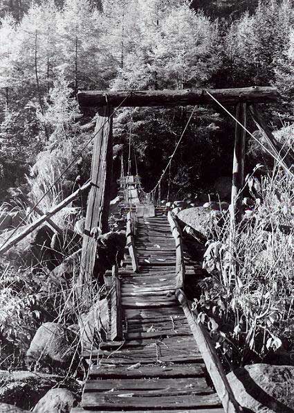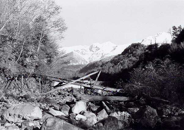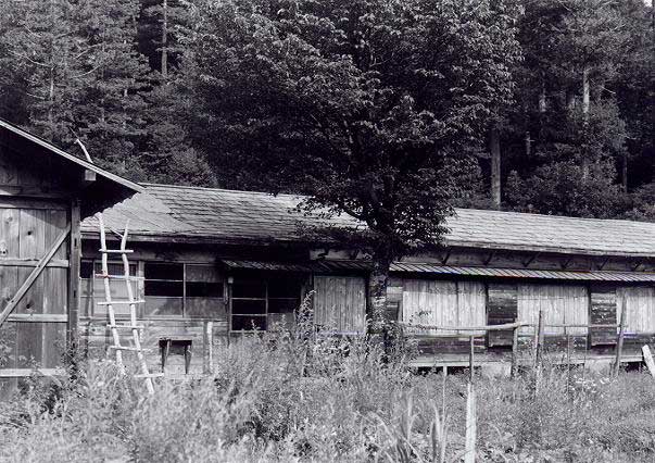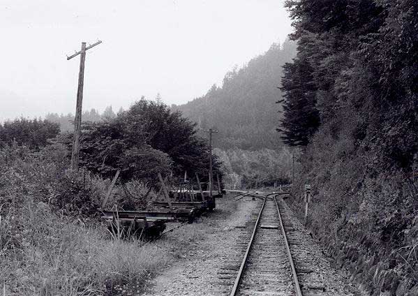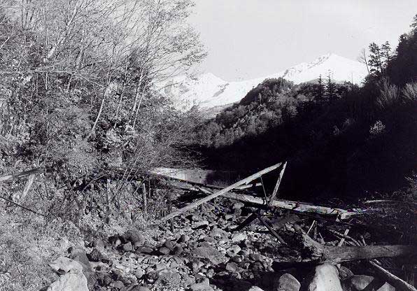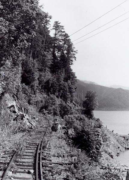 ![]() FG滝越から本谷まで林道が開通していたので、それを通って本谷まで行くことにしました。林道は、本谷に着く手前で三浦本谷線に沿っていましたので、その軌道跡を見ることができました。番号は不明でしたが、台枠にSKWが入っていましたのでNo.90, 94以降で、うっすらと読める文字からは、90番台であることが判りました。後方2枚戸、扉とキャブサイドが両方Hゴム、排気管と逆側にエアークリーナーカバーがあります。1977-8-3 ![]() H滝越−本谷間を列車の2倍以上の時間をかけて、やっと本谷に着きました。本谷には、まだ駅名標が残っていた他、B型客車や運材台車が数多く放置されていました。1977-8-3 ![]() I本谷駅の待合室になっていたB型客車です。屋根から見ると旧タイプのもので、このような車体が残っていたことはラッキーでした。車体側面には補強が入っています。1977-8-3 ![]() J本谷駅に軌道自転車が放置してありましたので、それを借用して5人乗りで土浦まで行くことにしました。三浦湖畔沿いには、所々落石がありましたが、その箇所は軌道自転車を担いで移動しました。1977-8-3 ![]() K高いところに登って、俯瞰をしてみたくなるような湖畔沿いに線路があります。対岸には水無線跡が見えています。1977-8-3 ![]() L土浦の合宿所は、既に廃屋のようになっていました。1977-8-3 ![]() M土浦駅から堤防上側を望む。ここから先は、草むして進むことができませんでした。この軌道自転車に5人乗りをして、1人で漕ぐのはハッキリ言って大変でしたね。草の抵抗は思うよりは大きいのです。1977-8-3 ![]() N濁川温泉の宿です。王滝村から滝越へ行く林道の途中にありました。温泉宿は林道から直下に10分程(登りは20分)下った所にあり、川原のすぐそばにありました。わざわざここに、林道から歩いて降りてきたのは、林道走行中に何か興味ある物が川原に「チラッと見えた」ためです。木曾森ファンの夏の合宿所にもなった、このひなびた温泉宿は、長野県西部地震により土石流に埋まってしまいました。ご冥福をお祈り申し上げます。1978-10-30 ![]() O濁川温泉の宿から対岸に渡る吊り橋です。向こう側半分がひどく壊れていて(踏み板がなく、ワイヤーのみ)、渡るにはレンジャー部隊の訓練さながら、となりました。しかし、「興味ある物」を確認するには、これを渡る以外には方法はありません。1978-10-30 ![]() P吊り橋から川原を歩くこと約30分でやっと姿が見えてきました。「ひょっとして」と思ったものは、やはり有名な濁川線の木製三角トラスの残骸でした。1978-10-30 ![]() Q長い間、「赤面もの」の駄作におつきあい願いまして、ありがとうございました。最後にお見せした濁川線の木製三角トラスには、私個人の深い思い出があるのです。思えばTMSに載った、このトラスの模型が私と木曾森を強く結びつけたきっかけであり、そしてそのトラスの現物を濁川温泉の2km程上流の濁川線廃線跡で見つけたとき、私の木曾行きは終わり、また私の「木曾森林鉄道のアルバム」は、この写真を最後に閉じられることになるのです。雑誌などで、このトラスの本体の写真を御覧になった方は多いと思いますが、紅葉の中、白き御岳をバックにトラスが存在していたことは、ほとんどの方がご存じないのではないでしょうか。私はあまりに素晴らしい光景を前に足がふるえ、「昔はここを運材が走っていたんだ」と遅すぎた自分を悔やみました。現在は長野県西部地震により土石流に埋まってしまい、この光景が2度と見られなくなってしまったのは非常に残念なことです。1978-10-30(終わり) 平成13年11月13日から始まった「巻本さんのアルバムから」も、今回で一応完結しました。約4ケ月に亘って合計176枚ものプリントを手焼きで送って下さり、しかも、スキャナーを経由してHP上に掲載した場合の調子が出るまで焼き直して下さるなど、大変お世話になりました。 勿論、本業があっての限られた貴重な時間を割いて頂き、感謝に堪えません。きっと、この資料が皆様の何らかのお役に立てることを願って止みません。(森川幸一) |