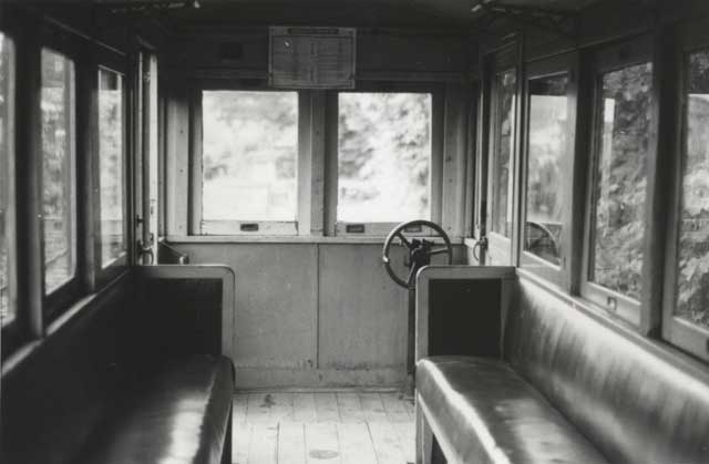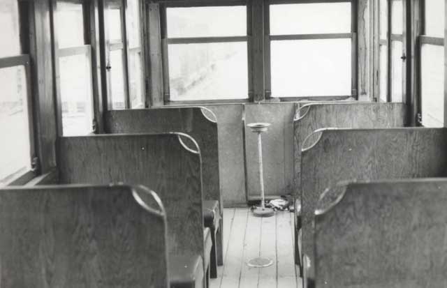 上松のNo.14車内。貼ってある紙には「木曽森林鉄道列車時刻表」と書かれています。