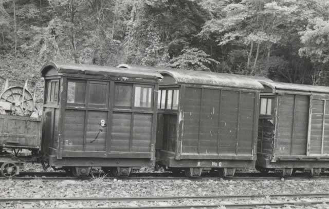 運材台車に板を載せただけの簡易無蓋車と砂利運搬車。向こうには助六型B型客車。