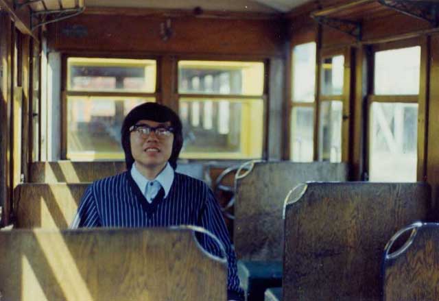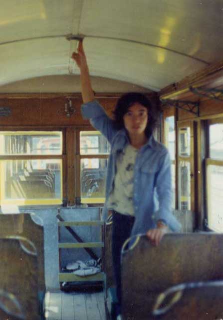 その車内風景。ニスで塗られた椅子、紺色のビニールシート、
