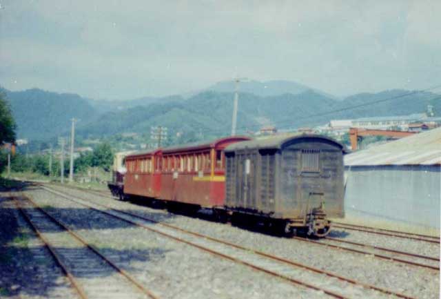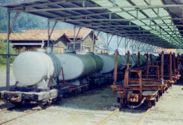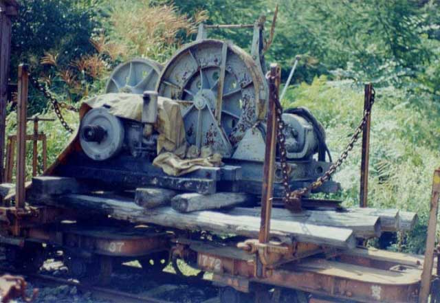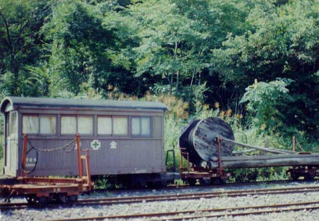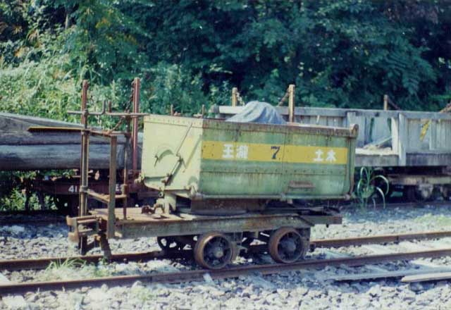 ![]() 小型集材機を運搬中の運材台車。 集材機が小型のため、台車どうしは直連結で丸太を渡しただけの応急的ゴンドラ。 ![]() 森林鉄道の主役たる運材台車。 ブレーキポストが丸棒なのは、モノコック構造のタイプです。 ![]() 田島にはガソリンの積込施設がありタンク車が集結していました。 ここから奥地の作業所まで燃料が運ばれていました。 ![]() 砂利運搬車。王滝土木と書かれていますが、カラーリングが違うものもありました。 ![]() 「みやま号」に連結されたE型貨車No.3。 定期的な荷はこの列車で運ばれていました。 ![]() A型ゴンドラ。いかにも大工仕事といった造りです。 その向こうには上松の薬剤撒布車と砂利運搬車が見えます。 ![]() 集材に使うケーブルを巻き取ったリールが、運材台車に積まれています。 |