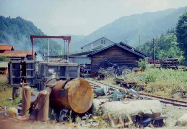 ![]() 田島停車場ホーム。「やまばと号」に乗った子供達が、ここから乗り降りしていました。 ![]() 田島機関庫。BLWが活躍した頃からあった木造の堂々とした造りです。 安全第一と書かれた部分は、無煙化によって塞がれたものです。 ![]() ![]() 機関庫とは背中合わせの修繕工場。 集材機のキャブは取り外せるので、いくつか転がっていますね。 ![]() 上の写真の位置から滝越方面を見たところ。 集材用ケーブルが、丸太を渡しただけの運材台車に無造作に積まれています。 ![]() 構内はずれから上松方向を見たところ。 2軸ゴンドラが転がっていて、A型ゴンドラやケーブルリールも見えますね。 |