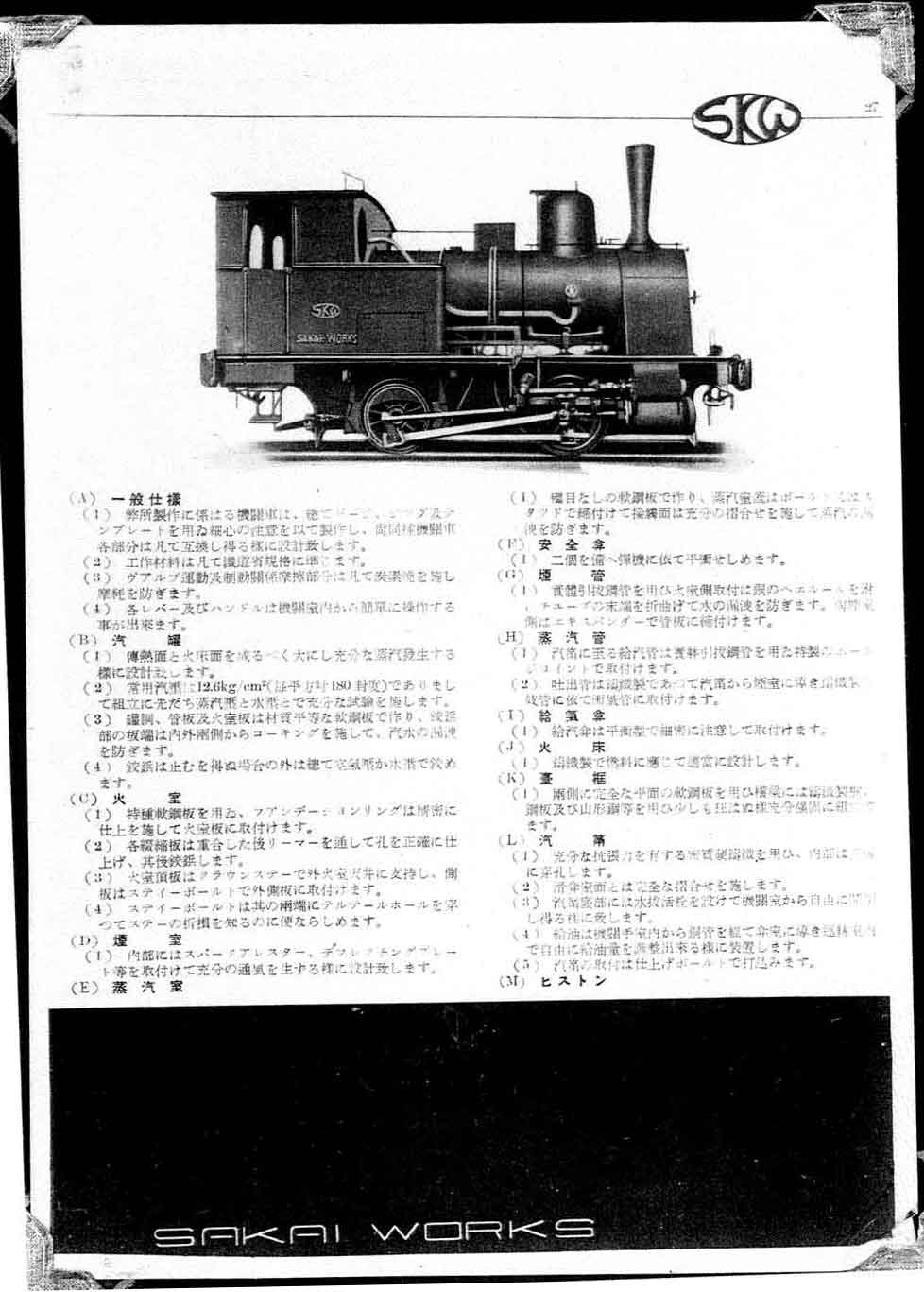 「この蒸機は酒井製ではなくて、もろヘンシェルあたりのカタログからコピーしたのではないかと思います。酒井で製造したのはガソリン入手難になった戦時中関東特殊製鋼辻堂向けの762mm軌間確か6t機?と森林向けで全部合わせても5両ほどだそうです。1067mm軌間での製造実績はないそうで、それも戦中からの製造ですから、戦時設計ならいざ知らず、このような古典的形態の機関車を作るわけないし、カタログの発行時期からしてもこのようなSLは製造していないはずです。製造実績があることから一応製造能力があることを誇示したかったのでしょう。」