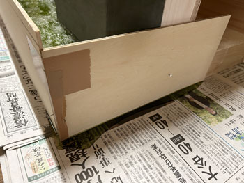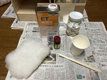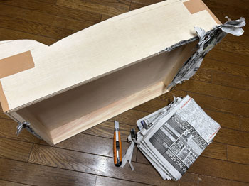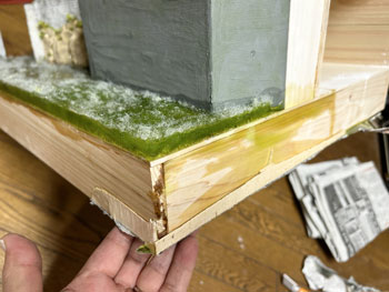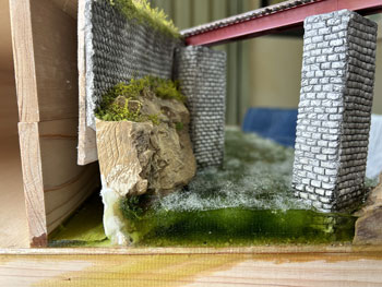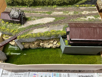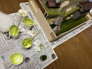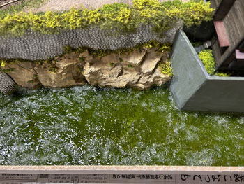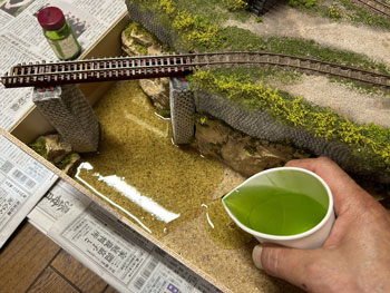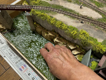 ![]() ![]() 使う材料は毎度お馴染みのデブコンET。 主剤2に硬化剤1を正確に混ぜて、それに僅かな水性インクを垂らして、よく攪拌します。 ![]() これを流し込んでいくのですが、結局180ml入るコップで5杯、水深を目標の15mm程度流し込んだら、2kgのデブコンを全部使い切ってしまいました。 このデブコンの硬化時間は25度の室温で2時間、完全に硬化するには24時間と説明には書いてありますので、慌てることはありません。 全部を流し込んだ状態は池のような水溜りですから、これでは死んだ水です。 ![]() それを生きた水にするために、家伝の秘方(^O^)、熱帯魚の水槽用のフィルターを千切って竹串で押し込むように埋め込んでいきます。 ![]() 埋め込みの感じも所々白波が立ったようにしたり、変化を出すようにしていきます。 橋脚の根元には流木が引っ掛かったようにもしてみました(^^♪。 ![]() これで暫くは放置して固まるのを待つ訳ですが、あれだけ隙間がないように注意したにも関わらず、やはり一部から漏れ出していました。 これは敷いた新聞紙を増やして床を汚さないようにするしかありません。 ![]() ![]() 流し込んだレジンはまだまだ固まりませんので、その時間を利用して人形を配置してみましたが、使った人形はエコーモデル製品です。 イベントで展示する際の車両配置をシミュレーションしてみて、それに呼応するように配置しました。 物干し台のオバチャンと作業員は阿吽の位置に、リヤカーを使おうとしてる作業員も配置しました。 ![]() ![]() レジンを流し込んで24時間が経ち固まったようですので、これから外壁を剥がしていきます(^_-)。 マスキングテープを剥がすときと同じで、この瞬間も結構緊張するんです(^O^)。 ベニヤ板で囲んだ外壁を剥がすのも、流れ出したレジンで固まっていて結構大変でした(@_@)。 このベニヤ板は捨てるつもりでしたから、引き剥がすようにして外したのですが、一部は台枠に強固に着いてしまっており、それをカッターで削いだりカンナで均したりしました。 レジンが流れ出すということは水位も下がってくる訳で、3〜5mm程度は下がっていましたが、これはある程度は想定内です。 |