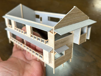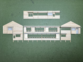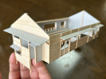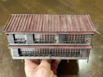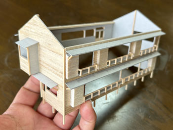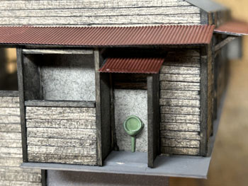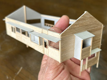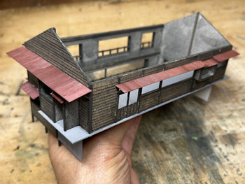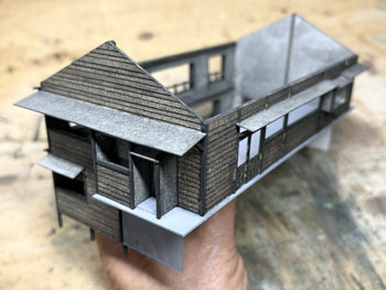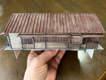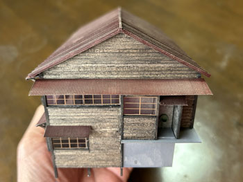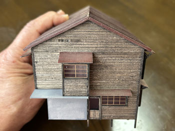 ![]() 発足したばかりの「木曽モジュール倶楽部」で2003年5月10日に「木曽の視察」が行われ、氷ケ瀬から黒淵まで歩いて行ったことがあります。 その時の模様が写真で残っています。 黒渕は助六へ至るウグイ川線と小俣線が分岐する場所で、ちょっとした中継基地でした。 そんな事からここには比較的大きな宿舎(地下1階式の)があり、そこで発生する洗濯物を陽当たりの良い詰所の屋根上で干したことから、あのような特徴的な詰所になった訳です。 山峡の狭いスペースの有効活用という事でしょう。 その時に宿舎の詳細な写真を撮っていましたので、21年前に作ったときと同様にこの写真を元に設計をする訳ですが、パソコンの画像を見ながら図面を描くというのはやりにくいので、A4の紙にプリントアウトしてみました。 幸いにも日本家屋というのは1820x910mmが基本になっていますので、このような写真からでも割と正確なものを作れます。 表側から見るとごく普通の大きめの詰所のようですが、裏側(つまり、ウグイ川の断崖側)から見ると地下1階の建物で、いかにも河辺に建てられた旅館のようです。 それがこの宿舎の最大の魅力なのですが、断崖にせり出した部分は頑丈なコンクリートの土台や壁で覆われていて、地下1階の半ばほどは見えなくなってベランダ状になっています。 ![]() 26枚の写真から寸法を割り出して図面を描いて、ボール紙に書き写して下見板を貼っていきました(^^♪。 左右は162mm、奥行きは84mm、高さは87mmという、ちょっとした2線機関庫のような大きなものになります(^O^)。 今回の建物は地下1階式ということだけでなく、窓割りも不規則で、しかも出窓があちこちにあるスタイル(@_@)。 ![]() ![]() 結構大変でしたが、こうやって3次元の形になってみると達成感(^O^)があって、頑張って良かった、生きてて良かったと思えます(*^^)v。 流石に詰所と違って大きいのでボリュームがあります(^_-)。 戸袋は収納する枚数の違いによって、3mm、4mm、5mmと違えてみました(^^♪。 ![]() 例によって薄く溶いたフラットブラックを何度も染めるようにして塗っていき、箱状に組み立ててみて発生した問題点を解決して、土台のコンクリートを厚いボール紙で作ってライトグレーに塗っておきました。 ひと晩経って塗り具合を見たら良い感じになっていたので、土台を接着して、より強固な建物になりました(^^♪。 ![]() ヒサシの部分にキャンベルの波板を接着してから艦底色で塗装。ここは屋根板を塗ったら一緒にウェザリングをします(^_-)。 ![]() あとは窓ガラスを貼って母屋は完成なのですが、やってみたかったことのひとつが男子用小便器(^O^)。 これは靴を脱いでまで宿舎の中のトイレを使うほどでもない場合に作業員が使ったものと思われ、結構良いアクセントになるなと思っていたんです(^^♪。 この小便器はいつか使うこともあるだろうと、ガレージメーカーがレジンで作ってヤフオクで売っていたのを2個買っておいたもの。 その「いつか」に恵まれた訳で、コックピット色に塗って貼り付けたらイイ感じになりました(*^^)v。 ![]() 屋根の制作です。 例によって厚めのボール紙を使いましたが、補強材?の本数は実物の写真でその本数を数えて、同じ数にしたら約6mmピッチになりました。 何も本数まで拘る気持ちはさらさらないのですが、同じ数にしておけばピッチの感じが同じになると思ったからです。 その補強材はいつものように1mmの角材を使用しましましたが、これはもう20数年前に東急ハンズでまとめて買っておいたもの。 幸いにも今回の分には間に合いましたが、1mm角材などというものは素材が桧という素材だけに、どうしても寸法にばらつきがあるのは仕方がありません。 僅か0.2mm違うだけでも見た目には正方形には見えず、そんなものは使うのを避けてきたので、ここにきてそんなものばかり4本(900mm長)が残っていました。 そのまま使うのには抵抗がありますから、カッターで削ぎ落して使いました。 今はこんな特殊な角材でもアマゾンで買えるので50本セットを注文しておきましたが、田舎に住んでいても便利になったものです(^^♪。 艦底色がなくなったので、松本まで行ってきました(^_-)。 ![]() ![]() 屋根を艦底色に塗って、充分に乾いたところでウェザリングマスターのサンドでニュアンスを付けて完成(*^^)v。 さて、次は地下1階の部分のコンクリート製擁壁というか土台を作らなければならず、これをどうやって作るか悩むところです。 紙ねんどで作れば質感は良いのですが、均一な厚みで作るのは無理だし、バルサ板で作れば加工もしやすくて良いのですが、何かでコーティングをしないと板の質感が残っちゃうし。 |