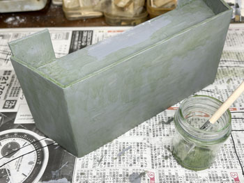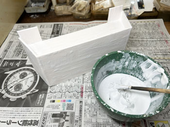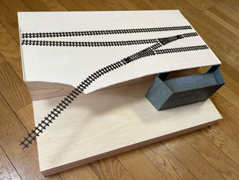 ![]() ![]() 宿舎も3次元の形になって大きさの感じも手に取って掴めるようになったので、レイアウトボードの材料を買いに行き、ある程度まで組み上げておきました。 素材はいつもと同じ4mm厚ベニヤ板と60x10mmの角材をホームセンターで指定の大きさ長さに切って貰いました。 帰ってからまず台枠を箱状に組み上げてその上に0m地帯になる板を重ねて置き、そこに線路と建物を置いておおよその位置を決定。 それに従って0m地帯の板を引き回しノコで切りました。つまり、いま箱状になってる部分はウグイ川の川底になる訳です。 ![]() ![]() 「擁壁」の高さは宿舎を置いてみて110mmとして、3mm厚と5mm厚のバルサ板で写真のように組み立て。 両脇の0m地帯と接する部分は少し長めに作っておき、レイアウトボードに充ててみてカット。 そして、宿舎と詰所を置いてみて感じを掴んだのですが、線路の位置は若干の修正が必要のようです。 ところで、木曽モジュール倶楽部でのボクのハンドルネームはジミー黒渕(^^♪。 これは最初に作ったモジュールが「黒渕ジャンクション」だったことに由来するのですが、同クラブが立ち上げた軽便祭も今年は20周年。 その年に期せずして同じ情景を作りたくなったのは、何か縁を感じます。 ![]() コンクリートの擁壁に石膏を塗って塗装。 石膏の乾燥は早いので、もう塗れるような状態になっていましたので、薄く溶いたライトグレーで何度も塗装。 ![]() ![]() これが乾いたら、今度は生えた苔を表現するべく、フラットグリーンを薄く溶いたものでニュアアンスを付けていきました。 特に内側のコーナーには入念に濃く。 これは放ったらかしになってるウチのベランダの苔を参考にしつつ(*^^)v。 ここで線路の敷設をしておきました。 予定よりも20mmほど奥にずらしたので、助六に至る本線が奥へ行ってしまい、山のスペースが減ってしまいました。 これ以上は擁壁にすることはないので、レイアウトベースに接着しておきました。 |