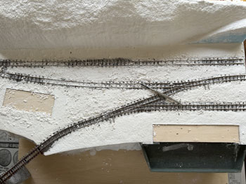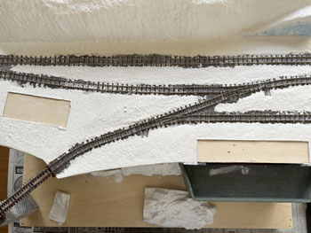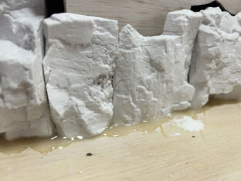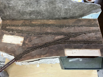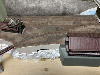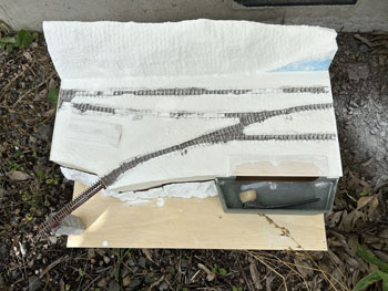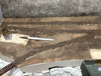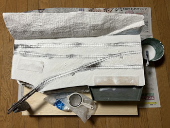 ![]() 地面に石膏を撒きます(^^♪。 石膏は天婦羅の衣よりも少し水が多い感じにして流れを良くしておきます。 半乾きのタイミングを見計らって、茶こしで石膏の粉を振り掛けて面を「粗」にします。 プラスタークロスも地面に撒いた石膏も完全に固まったら、外へ持ち出してブラシで余分な石膏を払い落とします。 ![]() そのあと建物の土台部分をマスキングしていた板を剥がし、マイナスドライバーを使って枕木など線路面に流れ込んだ石膏をこそぎ取っていきます。 ![]() ここで着色です。 まず地面はフラットアースを薄く溶いたもので塗っていき、裏山はフラットアースとフラットブラックを半々に混ぜて薄めたもので塗っていきます。 ある程度乾いたら、地面にも後者の塗料を使ってニュアンスを付けていき、単色の単調さを避けていきます。 流れ込んだ石膏を剥がしたりしていると、どうしてもレールの横の部分の塗装は剥げてしまいますので、この段階でフラットアースを原液のまま塗って補修しておきます。 これで出来上がったときに妙に光ったりしなくなります。 ![]() ここでようやく建物の土台をレイアウトベースに接着して、次に草を撒いたときの準備とします。 岩壁の固着は木工ボンドではどうも弱い感じがしたので、エポキシ系接着剤で補強しておきました。 |